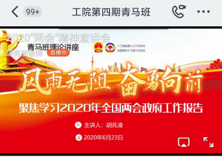 本网讯 (通讯员 胡兆凌)为深入学习贯彻党的十九大精神和2020年“两会”精神,培养学生关注国家时事政治的主人翁意识,增强学生的社会责任感与使命感,我院青马班于6月23日晚8点通过直播软件组织开展了“两会”精神专题学习会,全体青马班学员参与了学习。