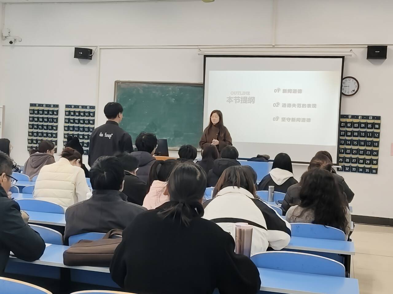课堂伊始,钟老师以一张“秃鹫凝视濒饿儿童”的纪实摄影作品为切入点,向学生抛出直击人心的设问:“若你身处现场,会选择按下快门记录瞬间,还是先救下孩子?”在学生们各抒己见热烈讨论的氛围中,她顺势锚定本次课堂核心主题——“新闻道德的边界与坚守”。课上,钟老师以“抽丝剥茧”的方式拆解新闻道德失范的现实图景:从“新闻报道失衡”导致的“刘学州事件”舆论反噬,到“AI虚假新闻”的传播风险,再到“新闻娱乐化”对公共议题的消解,一个个具象案例让学生直观感知到“失德”的代价。随后,她进一步提炼出当代新闻从业者的道德锚点——“坚守人文本位”与“践行人机协同”,为青年学子厘清了专业伦理的实践路径。课堂尾声,钟老师以《南方周末》的经典寄语“让无力者有力,让悲观者前行,让往前走的继续走,让幸福的人儿更幸福”作结,并发出“以人文温度筑牢新闻道德底线”的倡议,现场掌声雷动,引发深度共鸣。演练结束后,徐院长带领指导团队展开点评:既肯定了钟老师以案例引共鸣的创新教学方式,也围绕“课堂节奏的张弛把控”“互动环节的深度引导”等细节提出了精准的优化建议。