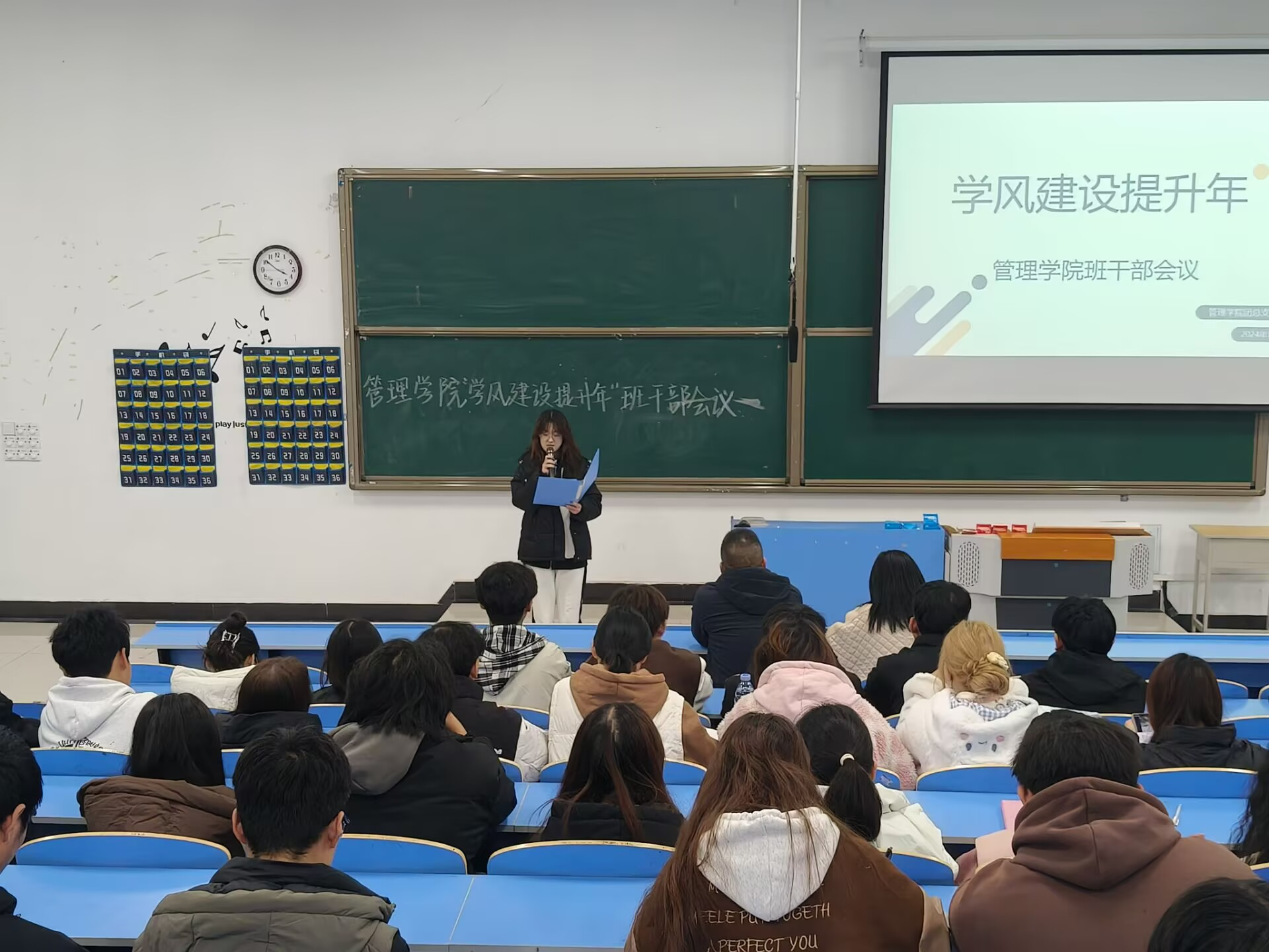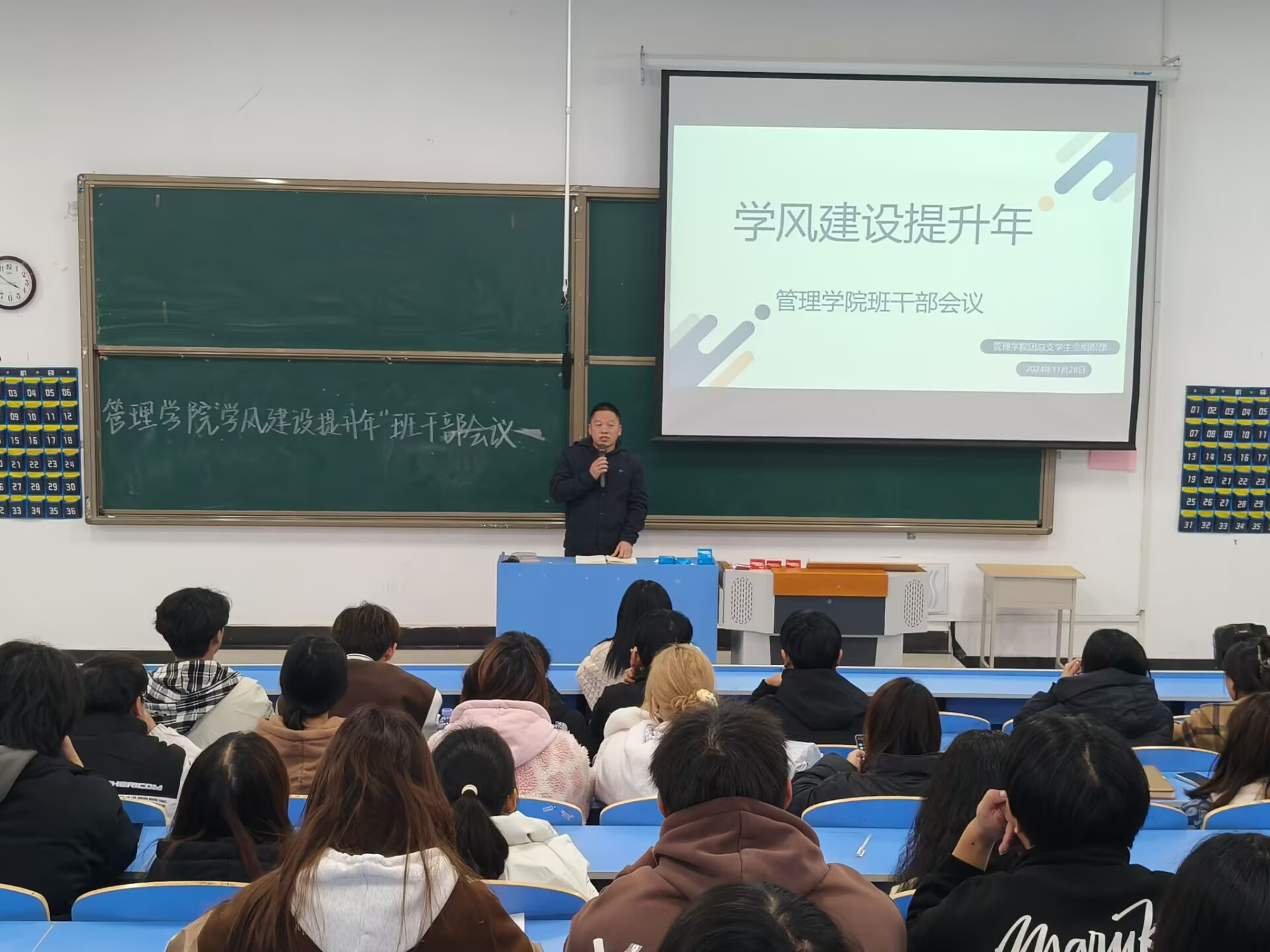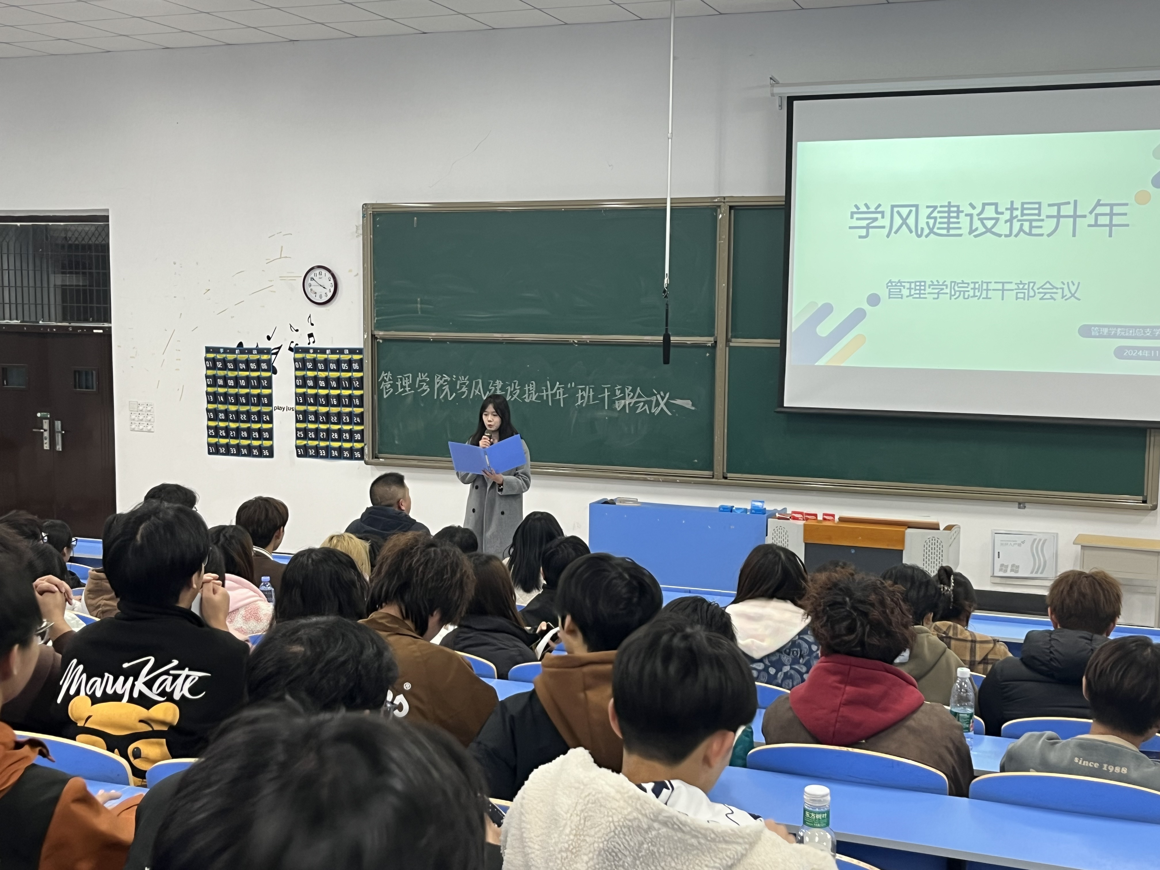 本网讯(何彦婷)为进一步加强学风建设,引导学生养成良好的学习习惯,提高学生的学习积极性和主动性,营造良好的育人环境和积极向上的学习氛围。管理学院于11月28日晚在5405教室召开“学风建设提升年”班干部会议,出席本次会议的有学院党总支副书记冯尧、学生第一党支部书记关婧瑶、各班班长、团支书。