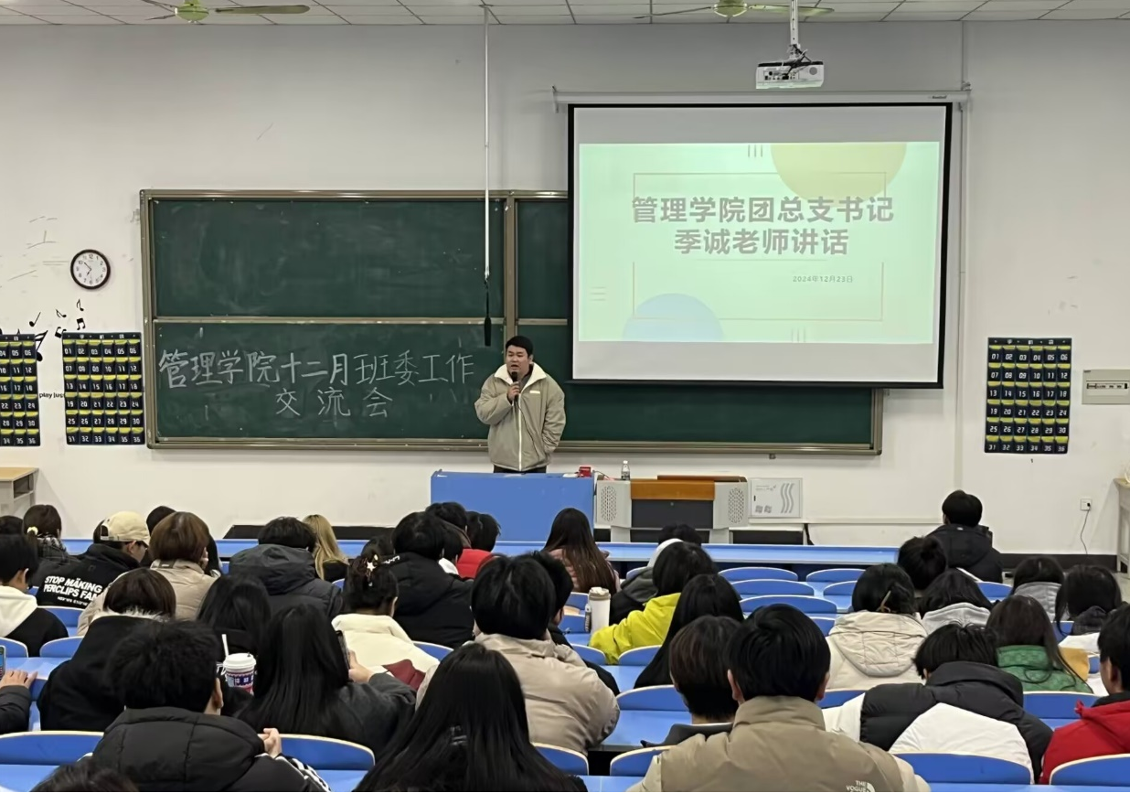 本网讯(通讯员:杜宁)为进一步加强班级管理经验交流,提升班委工作效率和质量,推动班级工作更加有序、高效地开展。管理学院于2024年12月23日晚在5405教室召开管理学院班委工作交流会,出席本次会议的有管理学院团总支书记季诚老师以及各班班委。