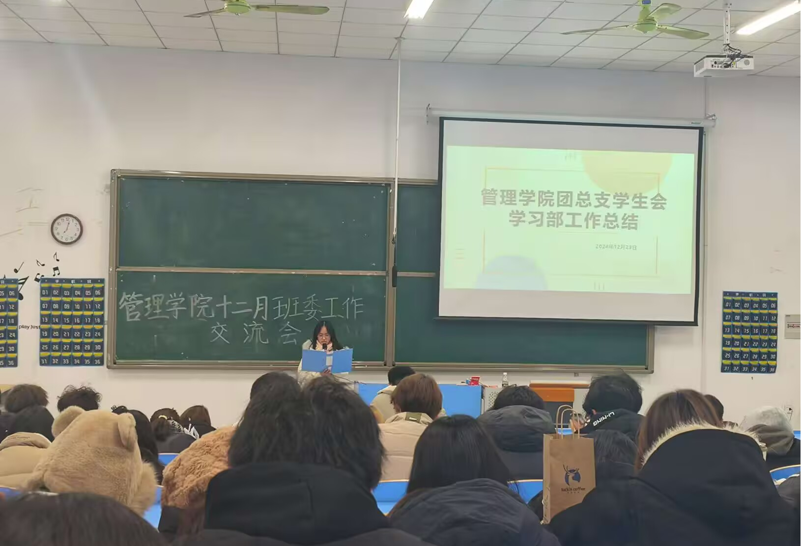 最后,管理学院团总支学生会学习部部长李智茹、学风督导队队长李冬芹和生活部部长吴雨帆,分别针对各班前一段时间的课堂情况、晚自习情况以及寝室情况进行了工作总结,并分享了下一学期将进行的工作安排,呼吁班委们再接再厉,做好表率,为同学们营造良好的学习氛围。