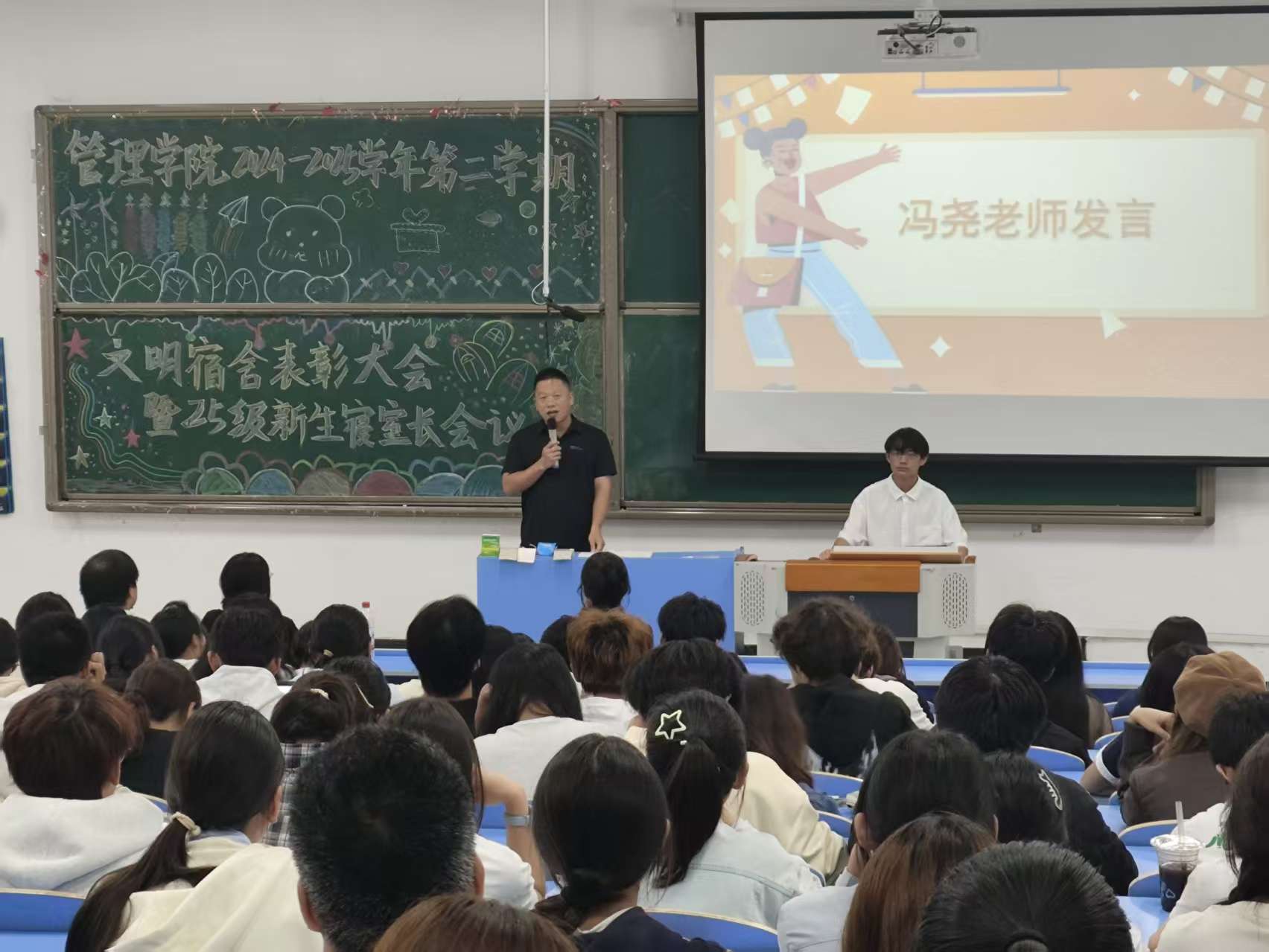 本网讯(通讯员:薛云清)为强化学生宿舍自主管理效能,厚植宿舍文明风尚,切实筑牢宿舍安全卫生防线,打造互助友爱的集体生活空间。管理学院于9月30日晚在5105教室召开9月份寝室长会议暨2024-2025学年第二学期“文明宿舍”表彰大会。出席本次会议的有学院党总支副书记冯尧、辅导员付雪梅、全体25级班长及寝室长。