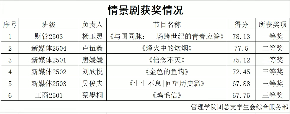 此次活动以喜闻乐见的艺术形式,让抗战精神走出书本、走进生活,并引导管院学子从历史中汲取智慧和力量,在新时代新征程上传承红色基因、勇担时代使命,以青春之我、奋斗之我续写时代华章。本次情景剧的落幕,不是精神传承的终点,而是奋进征程的起点。