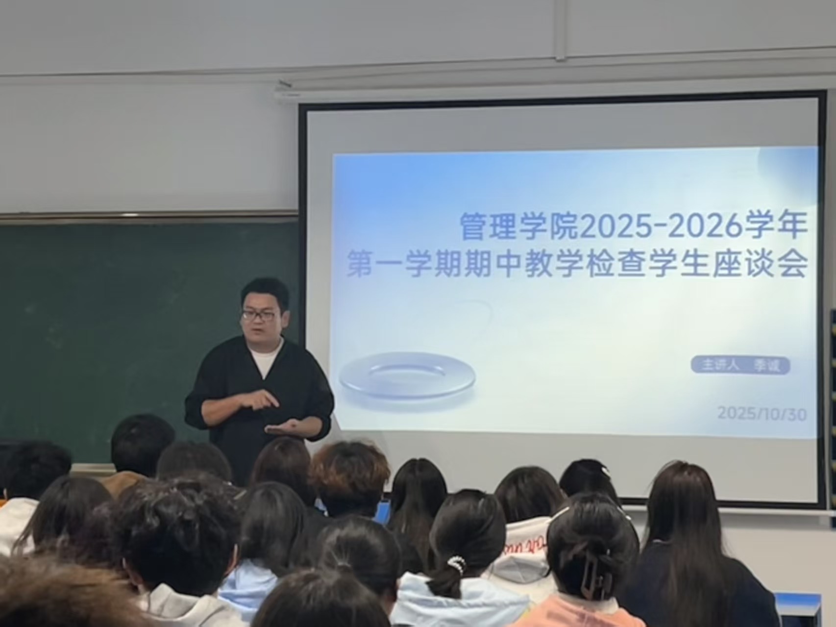 本网讯(通讯员:孙熙妍)为精准诊断教学问题,提升育人实效,管理学院于10月30日晚在6407教室召开期中教学检查学生座谈会。会议由学院团总支书记季诚老师主持,各班级学生代表参会。