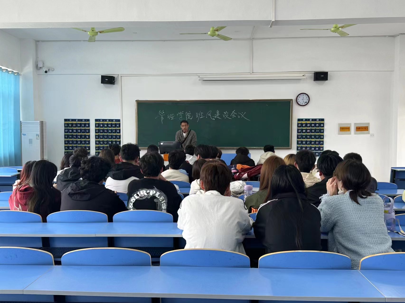 本网讯 为营造良好学习氛围,加强班风建设,管理学院于4月9日在6405教室召开班风建设会议,本次会议由管理学院副院长徐晓晗主持,22级、23级班委参加。