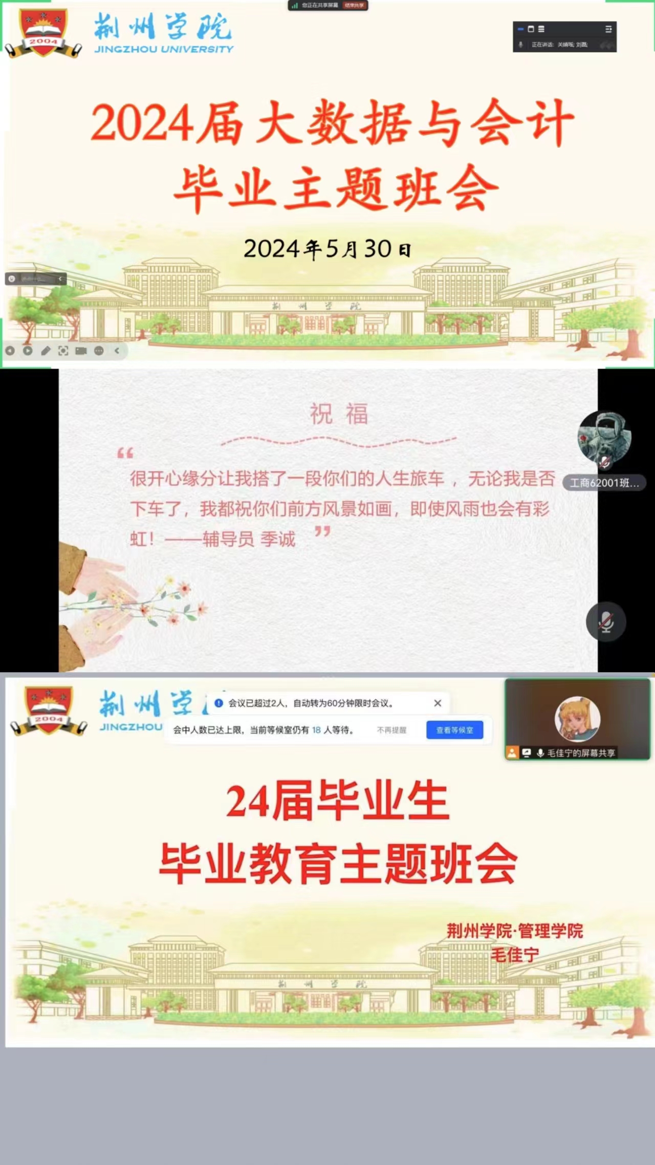 四年时光走过,凝结成多彩的记忆。本次毕业教育主题班会的开展会给2024届全体毕业生留下了祝福、期许和美好回忆,为下一步旅途增添动力。愿全体毕业生带着这份祝福与期许未来在各自的岗位发光发热,毕业不散场,未来皆可期!愿此去繁花似锦,再相逢依旧如故!