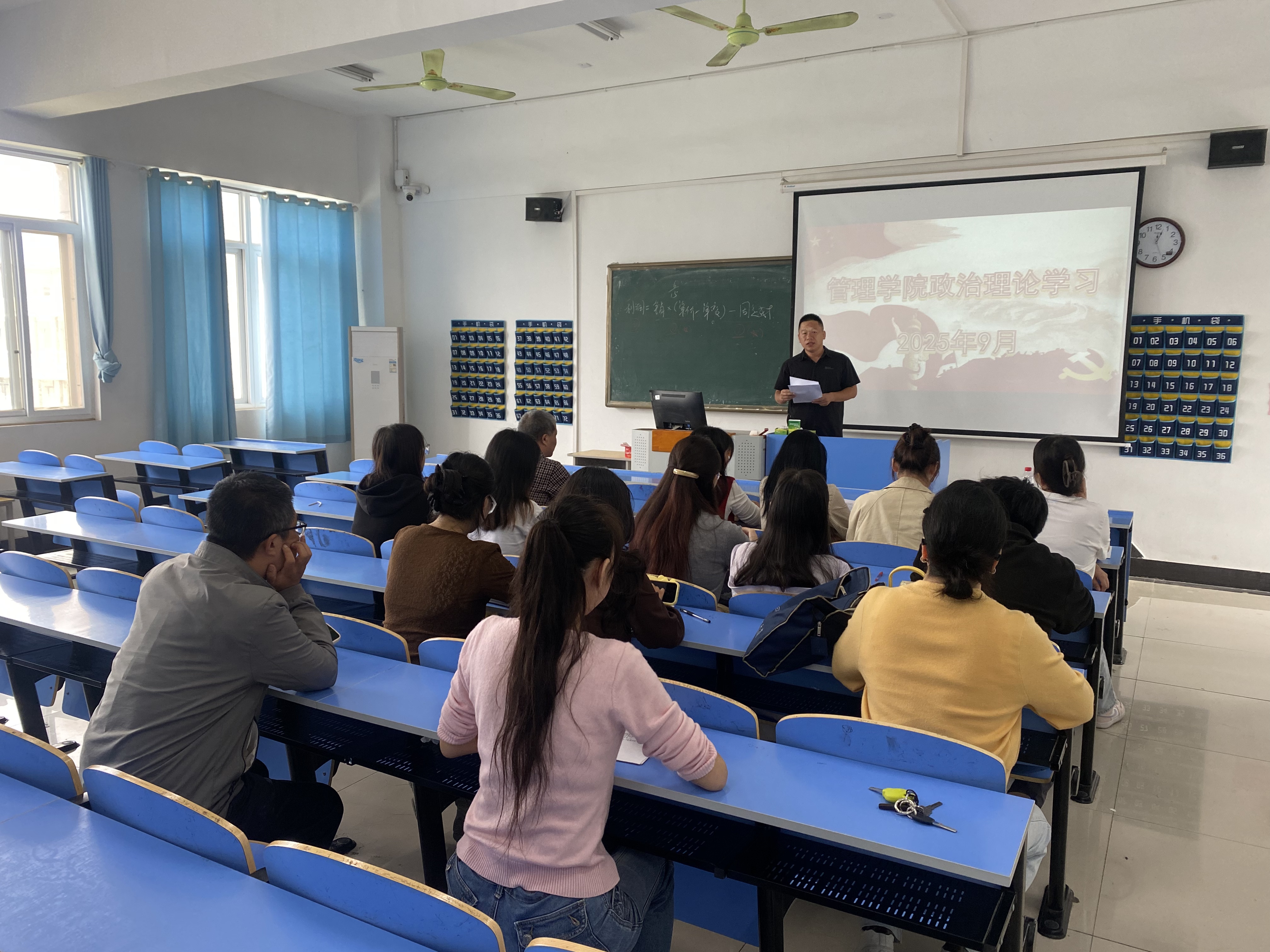 在政治学习中,管理学院党总支副书记冯尧带领全体党员共同学习了九月份政治理论。本次政治理论学习重点学习以下内容:1.习近平主席在纪念中国人民抗日战争暨世界反法西斯战争胜利80周年大会上的讲话2.《求是》杂志发表习近平总书记重要文章《弘扬伟大抗战精神,向着中华民族伟大复兴的光辉彼岸奋勇前进》3.习近平给全国特岗教师代表的回信4.习近平作出重要指示强调 锲而不舍落实中央八项规定精神 推进作风建设常态化长效化5.中国共产党湖北省第十二届委员会第十次全体会议公报。