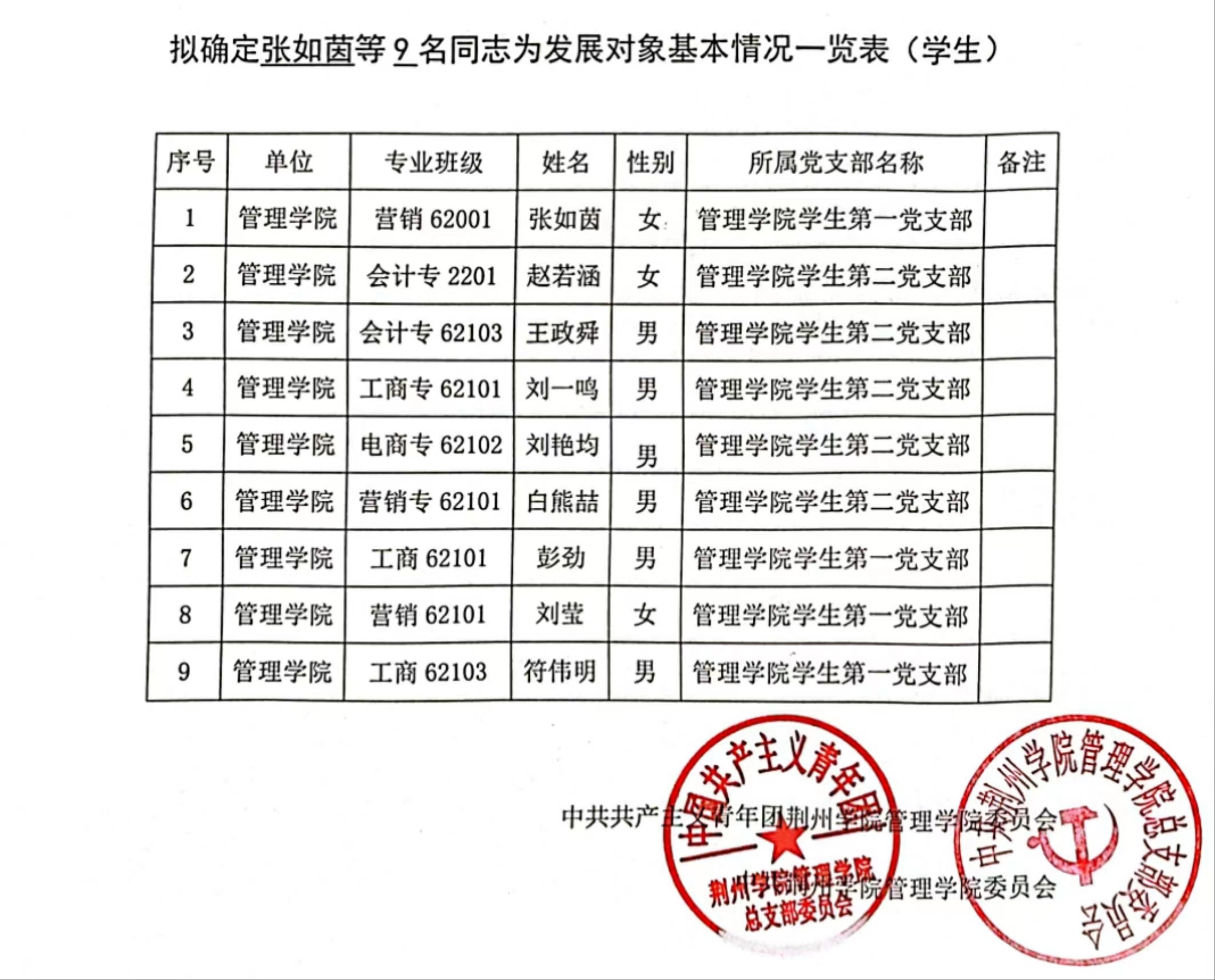 对经过一年以上培养教育和考察、基本具备党员条件的入党积极分子,经听取党小组、培养联系人、党员和群众意见(团员通过团组织推优),支部委员会(不设支部委员会的由支部大会)讨论同意,报党委备案后,拟确定张如茵等9名同志为发展对象,特在全院范围内进行公示。