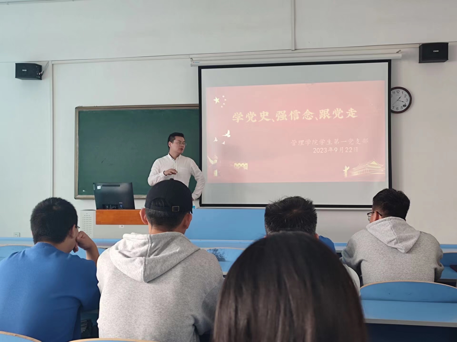 管理学院学生第一党支部书记吴正玉老师带领大家重温入党誓词。中国共产党的入党誓词,是新党员在入党时对党和人民作出的庄严承诺,同时也是党员必须遵守的行为准则,体现了党对党员的基本要求。