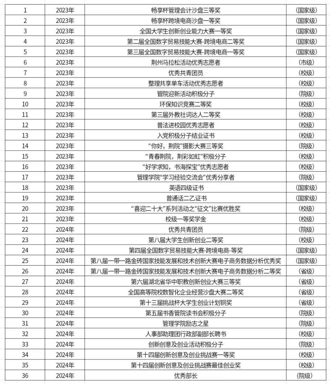连续两年文化和综测成绩班级第一,荣获一等奖学金,管理学院励志之星称号。