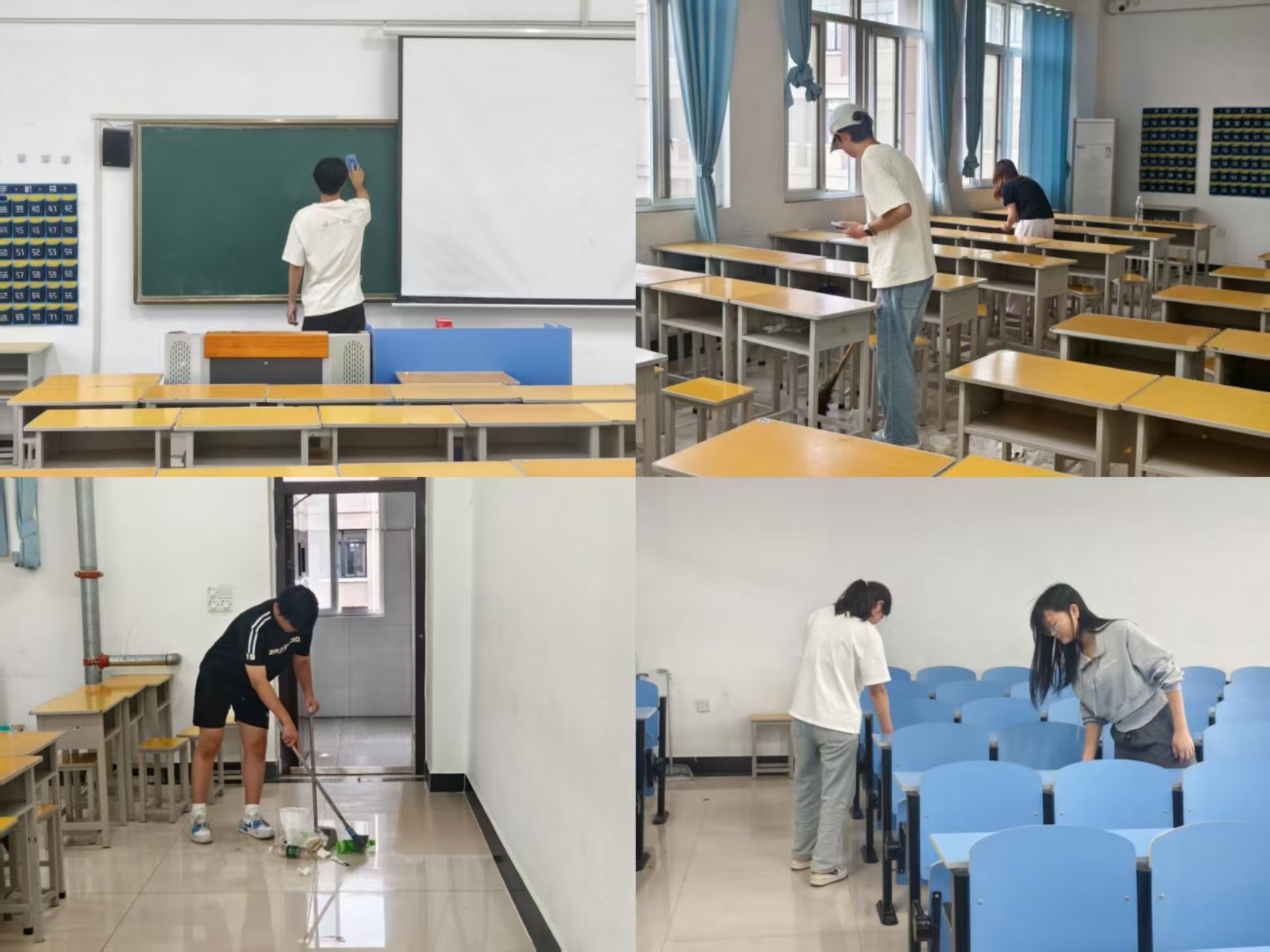 在教室里,同学们仔细地整理课桌椅,将它们摆放得整整齐齐,认真清扫地面的每一个角落,同时细致地查看并清除各个角落的杂物,以实际的付出展现劳动的价值,齐心协力为构建一个更为宜人、干净的学习场所而努力。