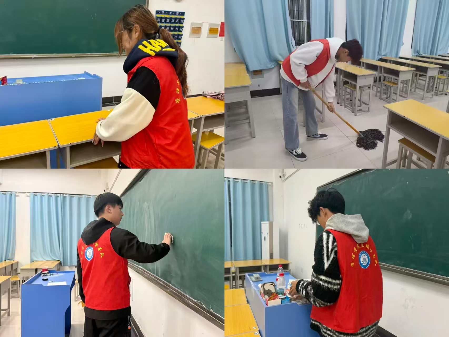 大家分工明确,针对教室卫生死角展开彻底清理,同时对桌椅进行规范调整。在此过程中,“责任、协作、尊重、共享”的公共服务意识植根于每位同学心中,大家将文明修养与集体荣誉感转化为一次次切实而温暖的实践,让文明之花在校园的每一个角落绽放。