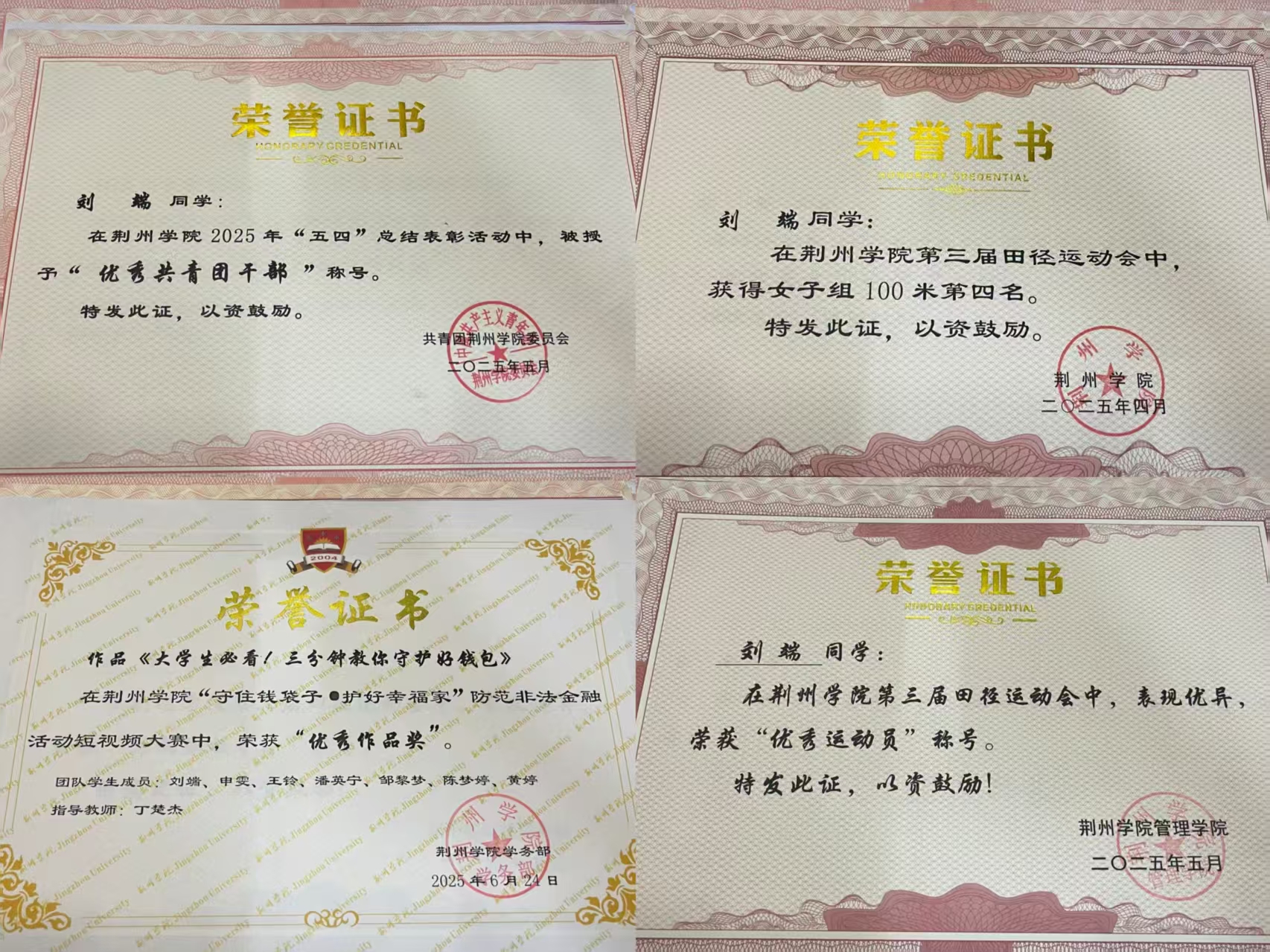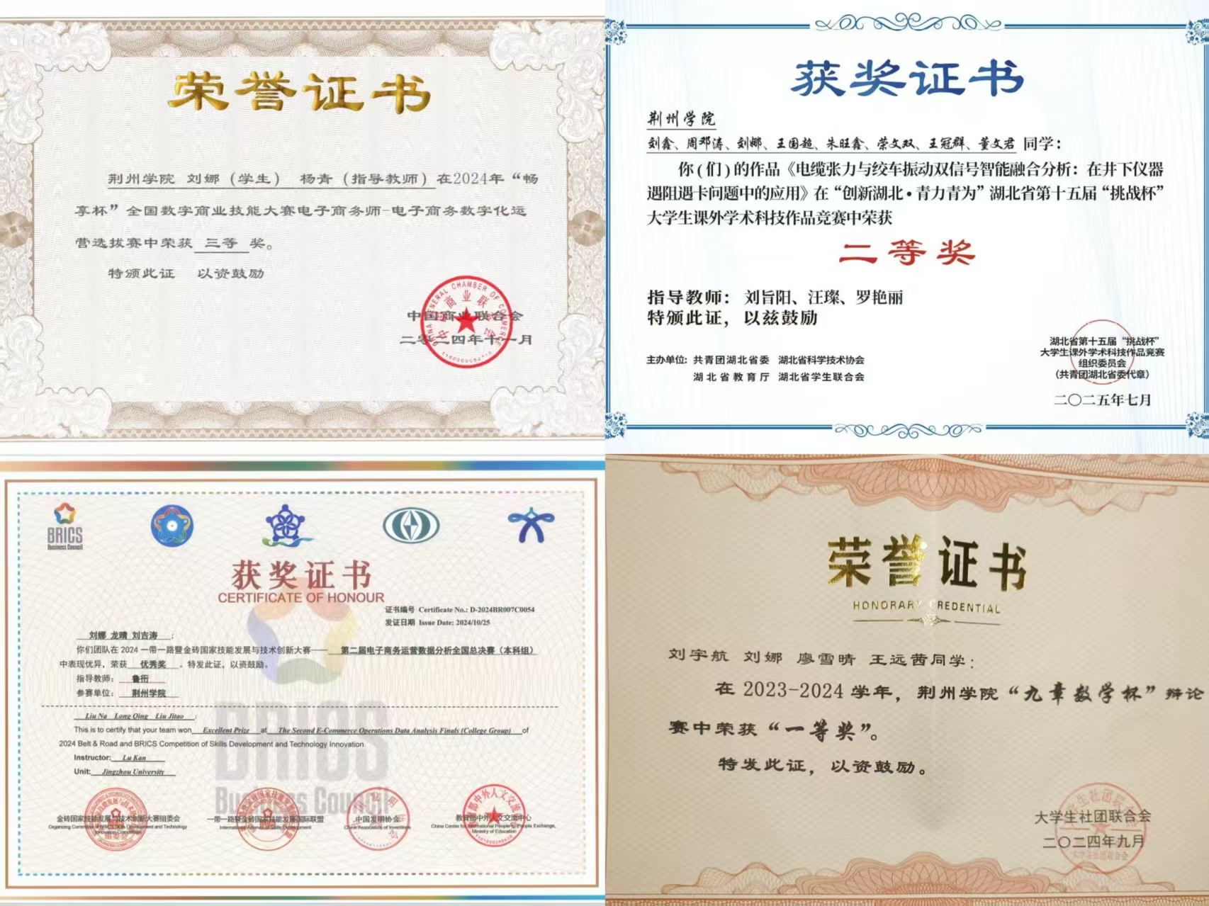 学业上深耕不辍,学业成绩与综合测评稳居班级第一,先后斩获一等奖学金及国家励志奖学金。竞赛中敢闯敢拼,荣获“畅享杯”全国数字商业技能大赛全国总决赛二等奖、一带一路暨金砖国家技能发展与技术创新大赛全国总决赛优秀奖、湖北省第十五届“挑战杯”大学生课外学术科技作品竞赛二等奖、第十五届全国大学生电子商务“三创赛”湖北赛区一等奖、校级大学生创新创业大赛一等奖、获校级“学创杯”创业模拟赛一等奖,以赛促学、以学促行,她实现学业精进与综合素养的全面提升,充分展现管院学子的奋进风采。