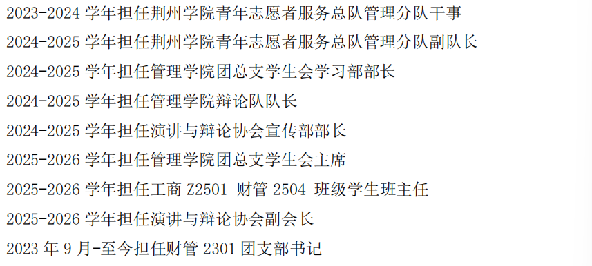 任职履历:曾任WilliamHill中文官方网站青年志愿者服务总队管理分队干事、WilliamHill中文官方网站青年志愿者服务总队管理分队副队长、管理学院团总支学生会学习部部长、管理学院辩论队队长、演讲与辩论协会宣传部部长,现任管理学院团总支学生会主席、工商Z2501、财管2504 班学生班主任、演讲与辩论协会副会长、财管2301团支部书记。