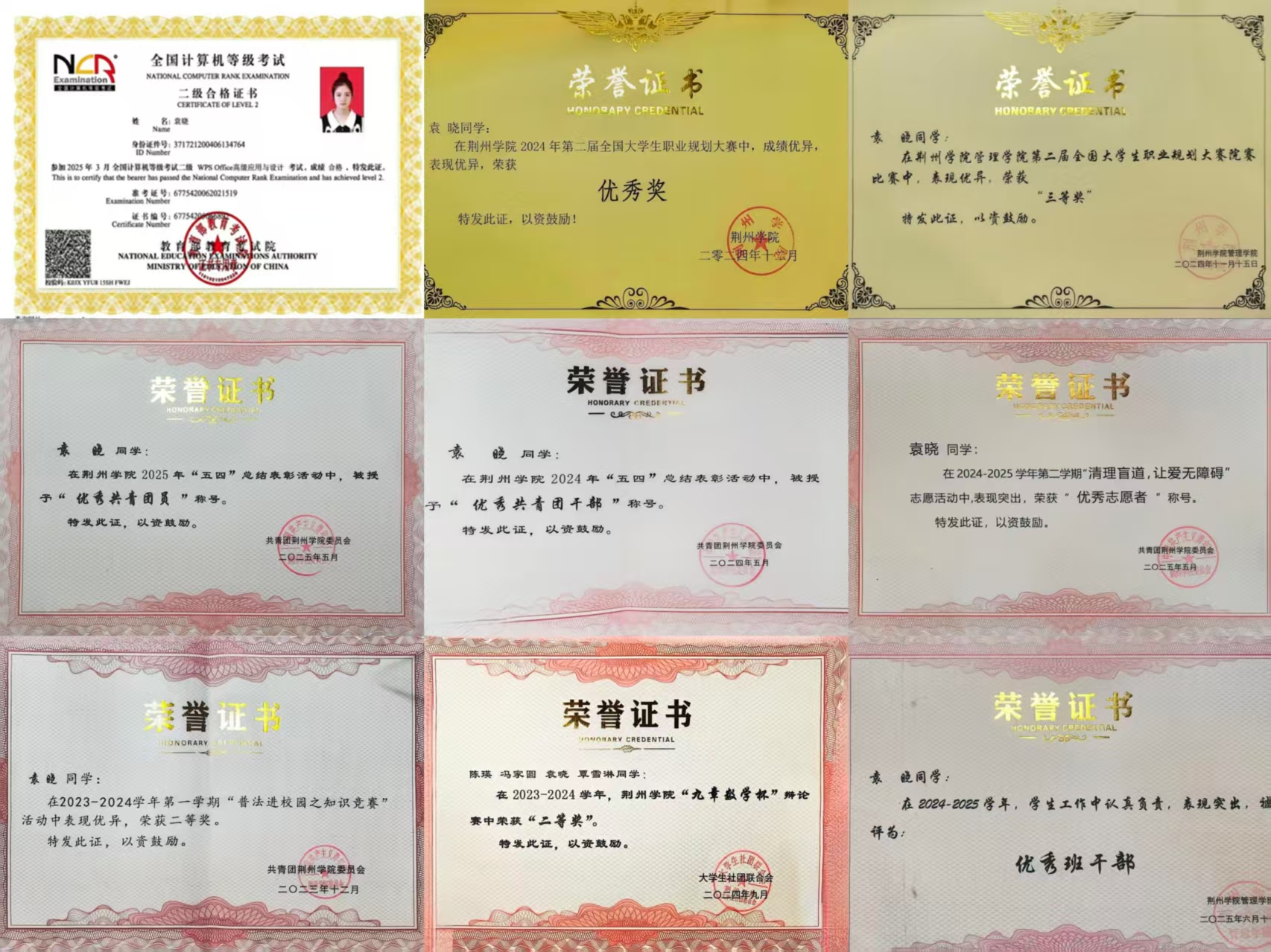 袁晓同学自入学以来,始终以饱满的热情投身于学习、工作与志愿服务中,展现出卓越的综合素质与坚定的奉献精神。在学习上,她勤奋刻苦,成绩优异,连续两年荣获国家励志奖学金,校二等奖学金,被评为管理学院“学习之星”,并在多项学科竞赛中屡获佳绩,如第七届全国数字贸易技能大赛二等奖、第十四届全国大学生电子商务“创新、创意及创业”挑战赛校级二等奖、第二届全国大学生职业规划大赛校级优秀奖、“东方财富杯”全国大学生金融安全网络比拼校赛优秀奖、普法知识竞赛二等奖等。她不仅扎实掌握专业知识,更积极拓展能力边界,已顺利通过英语四级、计算机二级、普通话二级甲等等级考试。