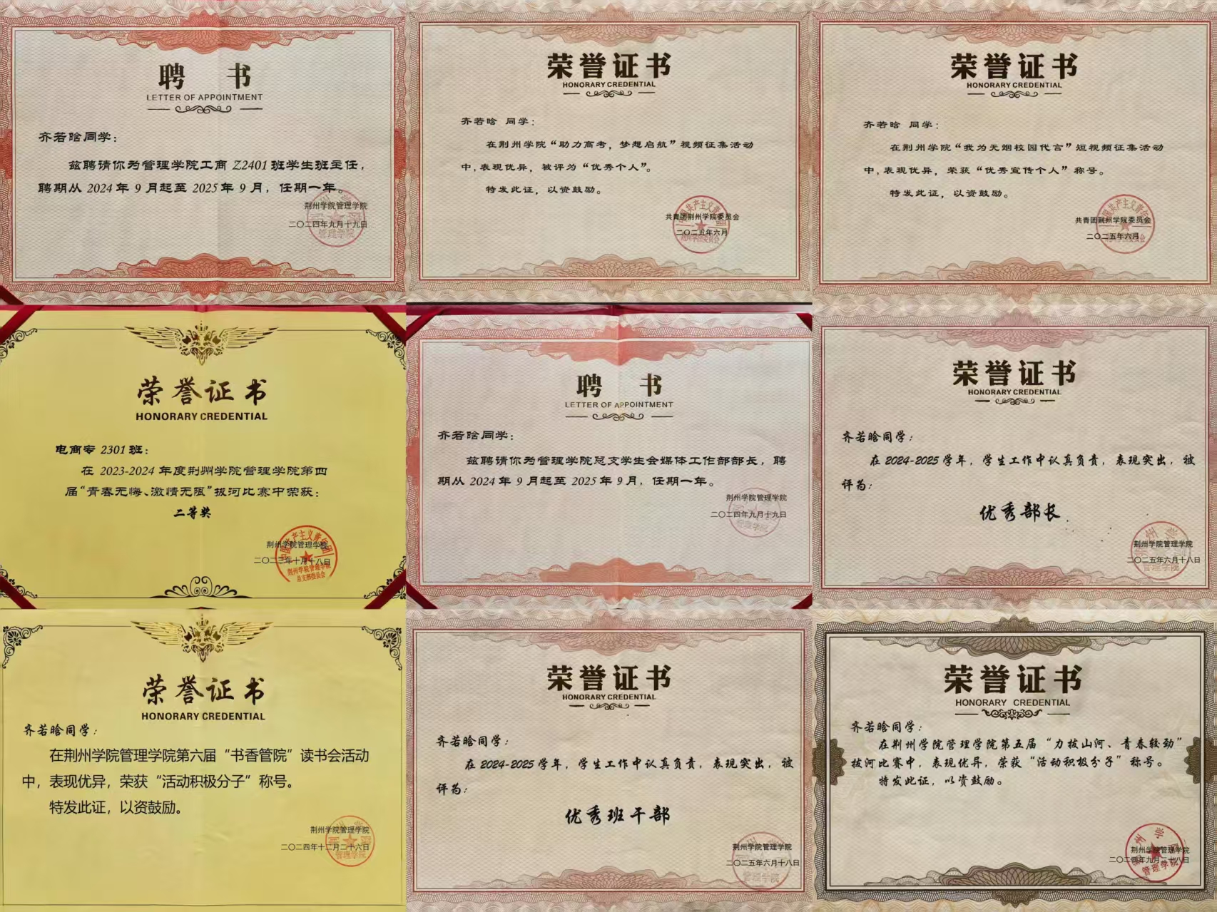 自踏入校园起,齐若晗同学以热忱为笔,以责任为墨,在学业、工作与生活的画布上,勾勒属于自己的成长轨迹。在学习上,始终将学习作为首要任务,沉心钻研专业知识,课堂专注聆听、课后勤于梳理,学业成绩与综合测评均稳居班级前列。为拓宽知识边界,她主动考取普通话证书,同时全力备战专升本,以持续学习的姿态,为未来积蓄底气;凭借扎实的学业表现,先后斩获一等奖学金、国家励志奖学金,让努力沉淀为成长的勋章。