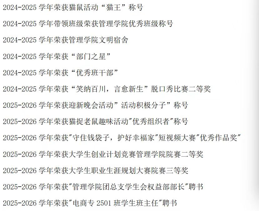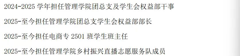 任职履历:曾任管理学院团总支学生会权益部干事,现任电商专2402班班长、管理学院团总支学生会权益部部长、电商专2501班学生班主任、管理学院乡村振兴直播志愿服务队成员。