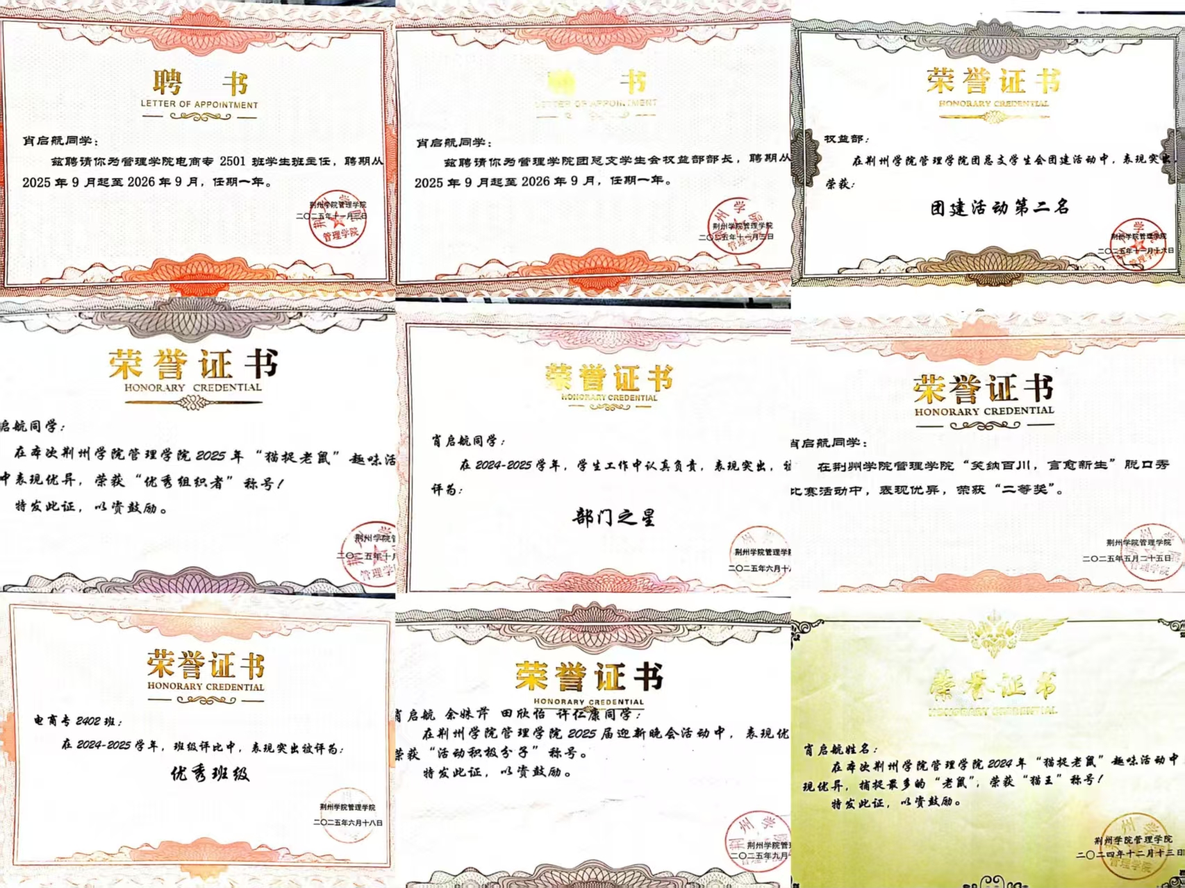 自入校以来,肖启航同学始终秉持积极进取、全面发展的信念,在学生工作、志愿服务、校园活动、学业提升等多个维度不断突破自我,展现出新时代大学生应有的责任与担当。在学生工作中,肖启航同学始终以服务同学、搭建沟通桥梁为初心。身为班级班长,他认真履职尽责,积极配合学院推进各项班级建设工作,助力所在班级获评2024-2025学年“优秀班级”,个人也凭借突出表现荣获“优秀班干部”称号。在担任权益部干事期间,因表现突出被评为“部门之星”,升任管理学院团总支学生会权益部部长后,他带领部门成员扎实推进权益服务工作,在部门团建活动中携手团队协作奋进,斩获第二名的优异成绩。同时,作为电商专2501班学生班主任,他主动关心新生的校园适应情况,全力协助辅导员开展班级管理与思想引导工作,用切实的行动传递温暖与责任。在志愿服务方面肖启航同学始终心怀热忱、甘于奉献,积极投身各类公益活动。他带头参与校园洁校活动,还校园一个美好干净;积极响应学校组织的“文明督导”志愿行动,劝导同学保护环境。凭借在志愿服务中的突出表现,他获评“优秀志愿者”称号,用实际行动诠释青年一代的奉献精神。校园活动是肖启航同学锤炼能力、拓展视野的重要平台。在趣味活动领域,他于“猫捉老鼠”趣味活动中凭借出色表现斩获“猫王”称号;在文艺舞台之上,他参加脱口秀比赛,以生动鲜活的表达赢得二等奖;在集体活动之中,他积极投身迎新晚会的筹备与参与,获评“活动积极分子”。在学科与职业规划类赛事里,他不仅拿下大学生职业生涯规划大赛院级选拔赛三等奖,还荣获第十四届“挑战杯”大学生创业计划竞赛管理学院院赛二等奖,更在学业上精益求精,不仅获评“学习之星”,更斩获了2025—2026学年国家励志奖学金和一等奖学金,真正实现了文体活动与学业竞赛的双向成长、全面开花。每一份荣誉,都是成长的珍贵印记;每一次经历,都是蜕变的坚实基石。未来,肖启航同学将继续保持昂扬奋进的姿态,在服务集体的过程中践行初心使命,在锤炼自我的道路上追求卓越极致,朝着既定的人生目标稳步前行。