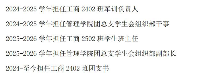 任职履历:曾担任管理学院团总支学生会组织部干事,电商专2401班军训负责人,现任电商专2401班班长、管理学院团总支学生会媒体工作部副部长、电商专2502班学生班主任、管理学院乡村振兴直播志愿服务队队员。