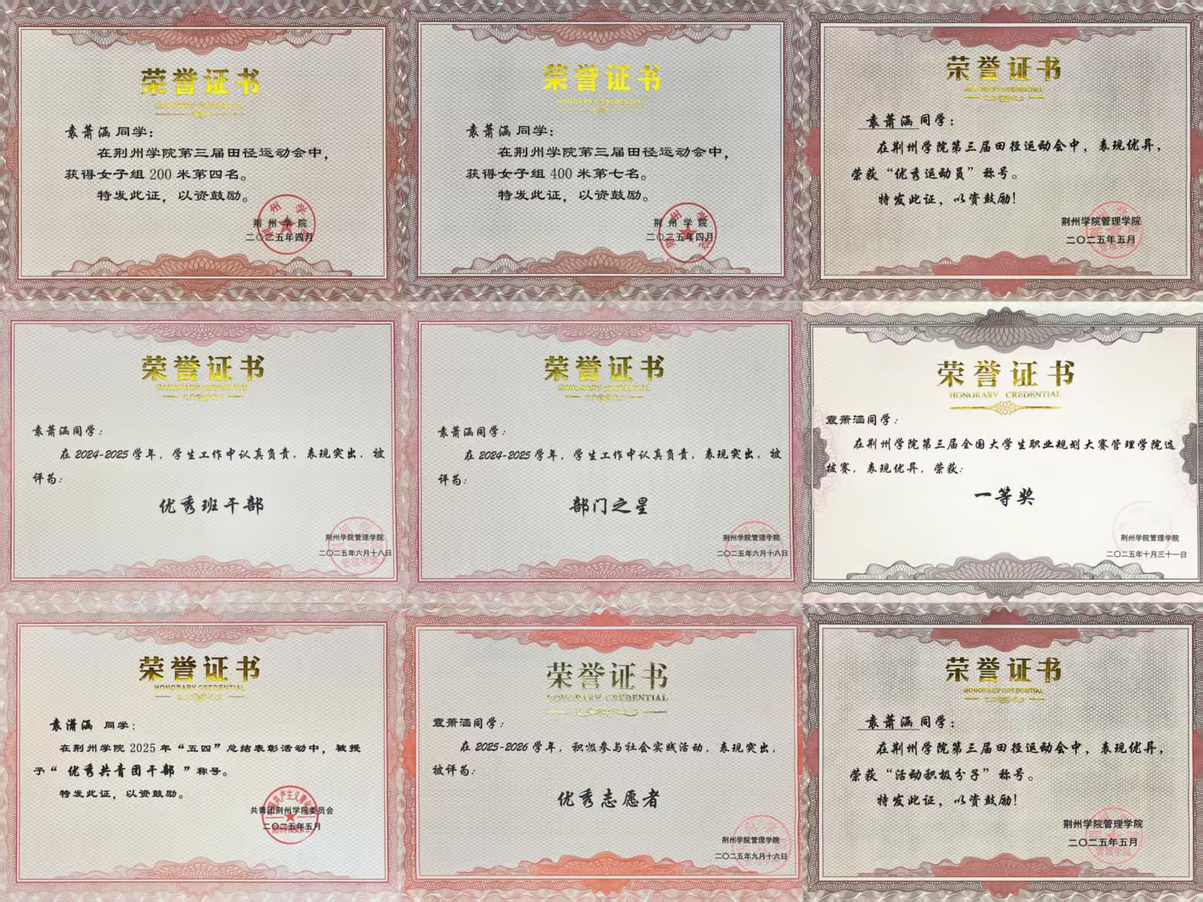 袁萧涵同学,以担当诠释青春底色,以勤学践行初心使命,始终在学习与工作的双赛道上奋力奔跑,以品学兼优的综合素养,展示出新时代青年学子的良好风貌。她始终将学业置于首位,在知识的海洋中破浪前行。面对繁重的学生工作,不仅专心学习筑牢学识根基,更斩获2025-2026学年国家励志奖学金与一等奖学金,获评“学习之星”。在学术竞赛的舞台上,她同样表现亮眼,凭借全国企业竞争模拟大赛国家级三等奖、“挑战杯”院赛二等奖等多项荣誉,生动诠释了“知行合一”的深刻内涵。在班级建设工作中,她身兼数职,从工商2402班军训负责人到现任团支书,再到工商2502班学生班主任,始终以高度的责任感扛起重任,用心搭建师生沟通的桥梁,全力凝聚集体向心力,凭借出色的组织协调能力和无私的奉献精神,荣获“优秀班干部”与“优秀共青团干部” 称号。在工作中,她从管理学院团总支学生会组织部干事稳步成长为现任副部长,凭借高效的执行力,荣获“部门之星”,并在“荆楚学子道中华,青春托举中国梦”演讲比赛中荣获“优秀组织者”称号,将服务的初心融入每一项工作细节之中。 赛场之上,她是挥洒汗水的运动健儿,在第三届运动会中夺得女子200米第四名、400米第七名,获评“优秀运动员”称号,尽显顽强拼搏的体育精神。志愿路上,她是传递温暖的践行者,累计荣获两次“优秀志愿者” 称号。此外,她在短视频大赛中获三等奖,并带领宿舍斩获“文明宿舍”,充分展现了全面发展的综合素质。青春因磨砺而出彩,人生因奋斗而升华。袁萧涵同学怀揣热忱奔赴热爱,秉持笃行迈向远方。她以拼搏浇灌梦想,用实干铸就荣光,在逐梦征程中步履不停,终将绽放更耀眼的芳华!