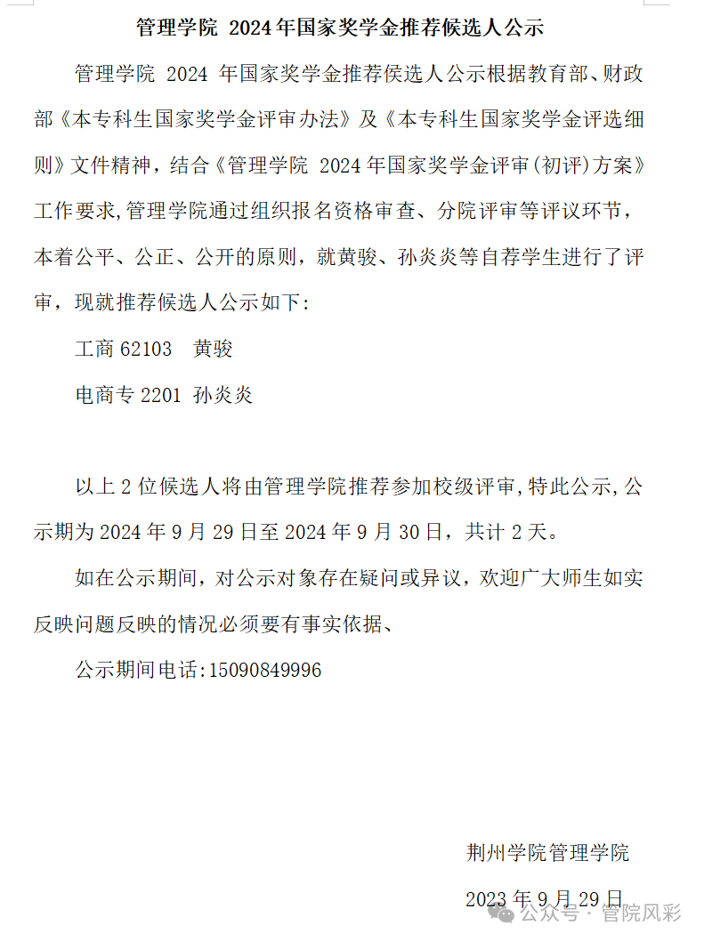 管理学院2024年国家奖学金推荐候选人公示