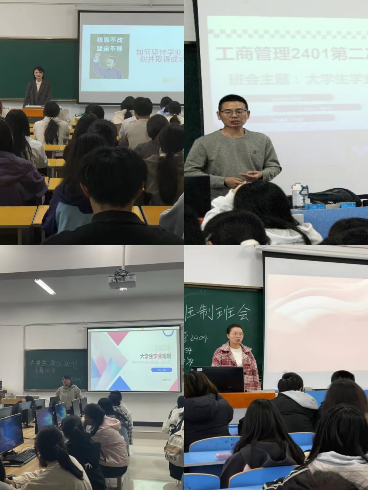 管理学院副院长徐晓晗老师在工商2402班的班会上提醒同学们要结合自己的兴趣、优势和未来职业规划,学好专业知识,做出明智决策,鼓励同学们不要畏惧困难与挑战,要勇于尝试新事物,在实践中不断探索与发现自己的潜力与兴趣点,并表达了对同学们的未来期许;电商2401班教师党员,电子商务专业教研室主任鲁衎老师则强调了时间管理是确保学业规划有效进行的关键因素之一,向同学们介绍了制定计划,列出任务清单,包括课程学习、作业、考试复习、阅读书籍等所有学业相关事项,按重要性和紧急程度排序这一学习方法;会计教研室主任范苏丹老师则与财管2401、财管2402两个班级提出“四个方面”——确定学习目标、分析课程需求、合理利用学习资源、监测学习进度,强调平时的积累十分重要。除此之外,各班老师还为同学们提供了许多具体而实用的方法。如目标导向学习法、番茄工作法、预习 - 学习 - 复习三步法。也提醒同学们学业规划不是一成不变的,是动态的,应当根据自身实际情况实时调整规划,千万不可陷入思维的“死胡同”,确保学业规划始终与个人发展需求和外部环境相适应。