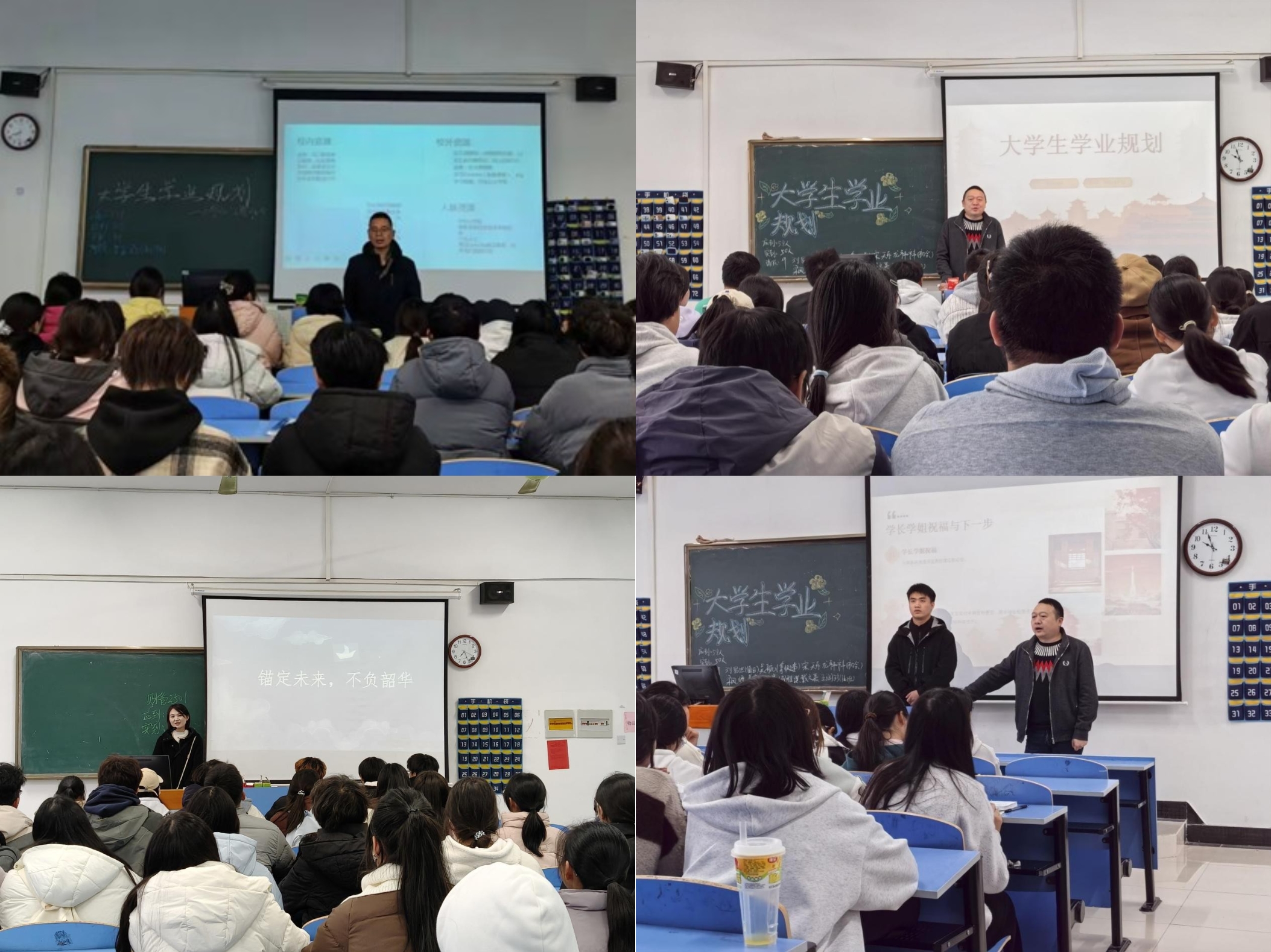 在互动答疑环节,同学们热情高涨地主动提问,将学业规划中的疑惑逐一倾诉,既有对多学科学习时间分配的纠结,也有对课外实践、兴趣社团选择的迷茫。教师们结合专业培养要求与教学经验,精准点拨学业重点、明晰发展方向,针对性解答核心困惑;学长学姐同步悉心倾听每一个问题,结合自身求学经历补充实操建议,分享高效时间管理方法与学业推进技巧,师生协同助力大家理清学习思路、提升时间利用效率。在老师的专业引导与学长学姐的经验分享下,同学们沉心思考、梳理方向,着手勾勒个人学业蓝图,从学期短期小目标到毕业长远发展规划,结合自身兴趣、专业特色与职业期许认真谋划,相互交流想法、分享心得,现场互动氛围浓厚,充分展现出主动规划、积极成长的良好风貌。
