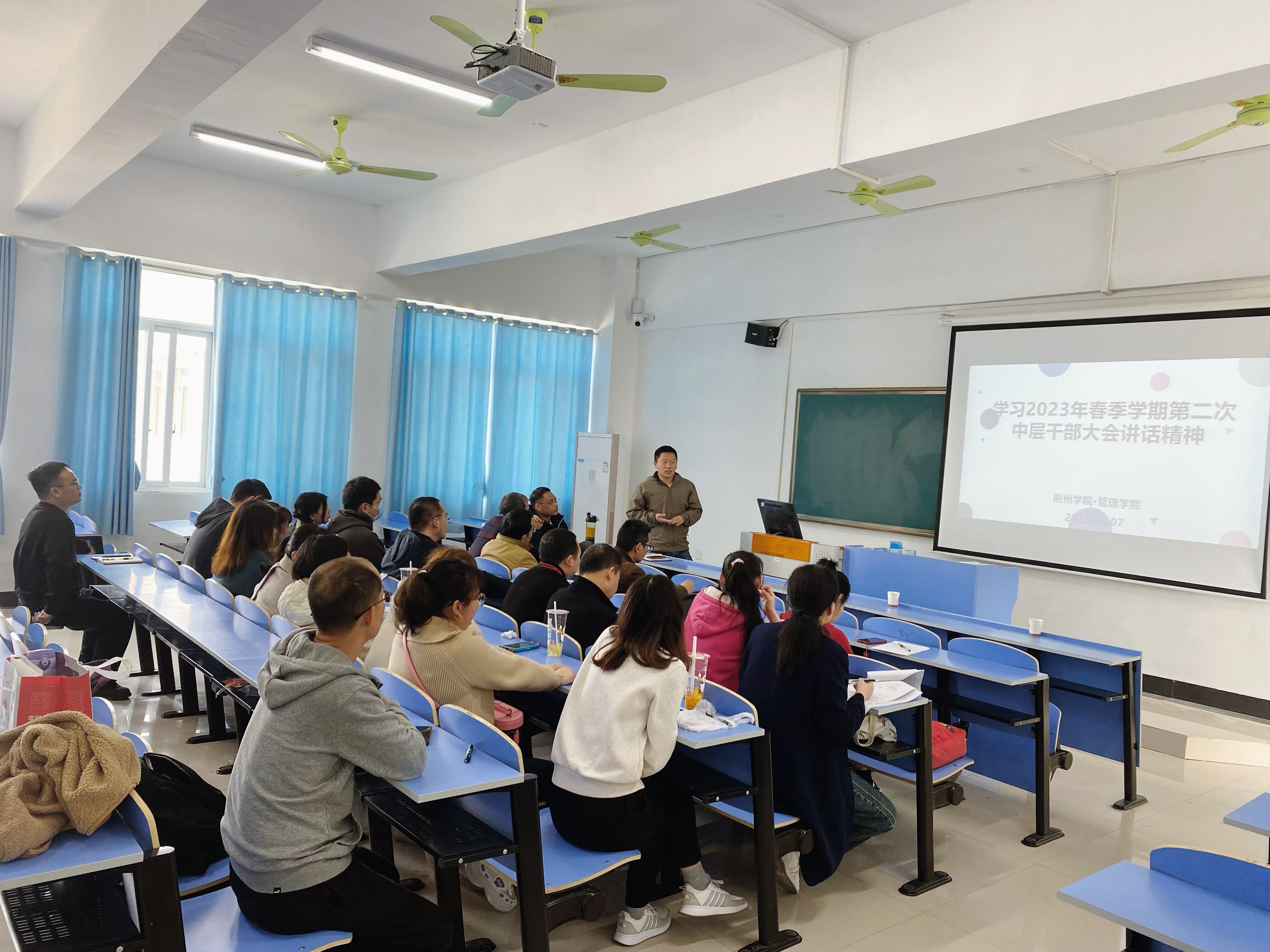 本网讯 3月7日中午,管理学院在J6408教室组织分院全体教职工集中学习了学校2023年春季学期第二次中层干部会议讲话精神,会议由管理学院副院长徐晓晗主持,管理学院党总支副书记冯尧及分院全体教师和辅导员参加了会议。