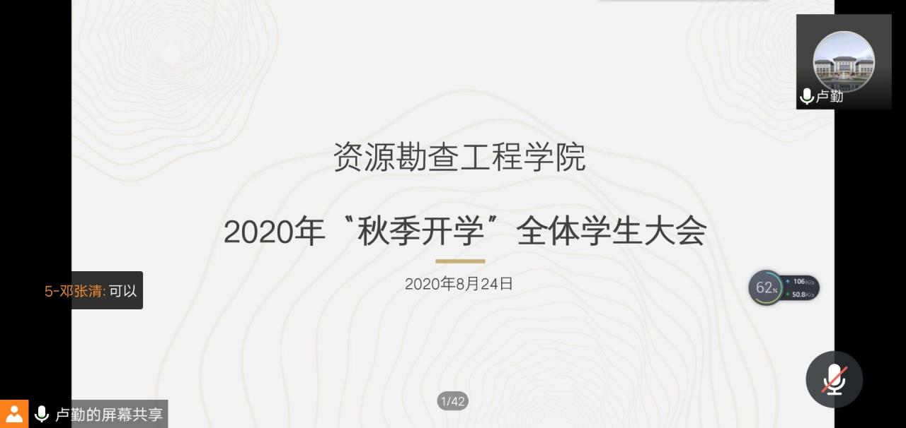 本网讯(通讯员 刘涵尊)为保证同学们能够顺利安全返校,资源勘查工程学院于8月24下午3时组织召开2020年“秋季开学”全体学生大会。此次大会由资源勘查工程学院党总支副书记卢勤老师主持,资源勘查工程学院团总支书记肖淳老师以及17级、18级、19级全体学生参加会议。