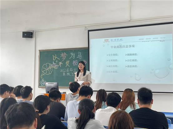 在2022届毕业生“以梦为马,不负韶华”主题班会上,信息工程学院辅导员王佩首先就毕业生离校工作进行了安排,针对顺利升学的同学、就业的同学、求职中的同学、准备考公的同学进行了叮嘱和临别赠言,期望即将毕业的同学们安全、文明、诚信、有序、圆满、自信、感恩的离校,为自己的大学生活划上圆满的句号。同时,王老师还鼓励广大毕业生成为有理想、有追求、有担当、有抱负的新青年,为实现中华民族伟大复兴奉献青春力量。
