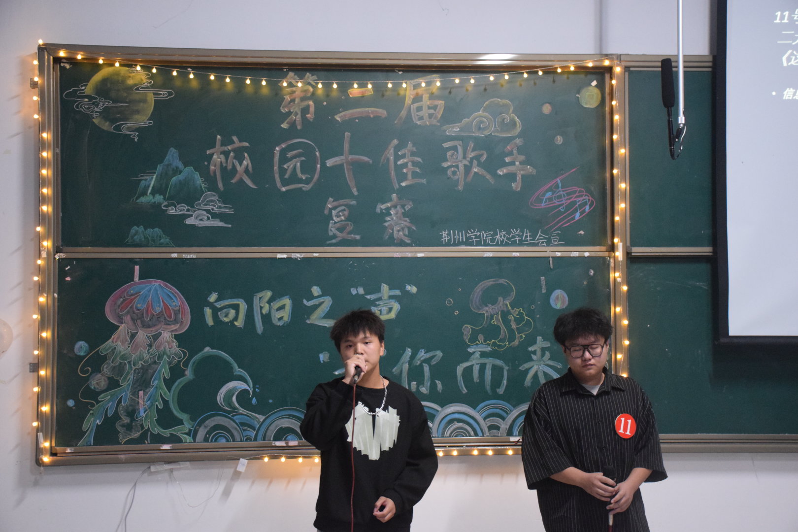 复赛的主持人是信息工程学院计应专2202程龙和艺术与教育学院学前2202伏琪琪。比赛现场异常激烈,每位选手都以最佳的水平为观众们创造了一场盛大的视听盛宴。选手们怀揣着梦想,用他们的歌声渲染着每位观众的心。复赛在特邀嘉宾音乐之声社长罗佳妮带来的歌曲《花海》拉开了序幕。一号选手付佳茜演唱歌曲《冬眠》,她用优美的旋律以及动人的歌词,表达了爱情如四季般变化。三号选手张子仪携乐队带来的彝族歌《不要怕》,给予观众强烈的震撼力,令在场所有人都陶醉其中,无法自拔。二十号吴培生用标准的粤语唱出《真的爱着你》,深深地感染在场观众。评委们根据不同的选手特点也给出了相应客观的评价和建议,同时也鼓励选手,无论结果与否,都要保持着对音乐的激情与热爱。