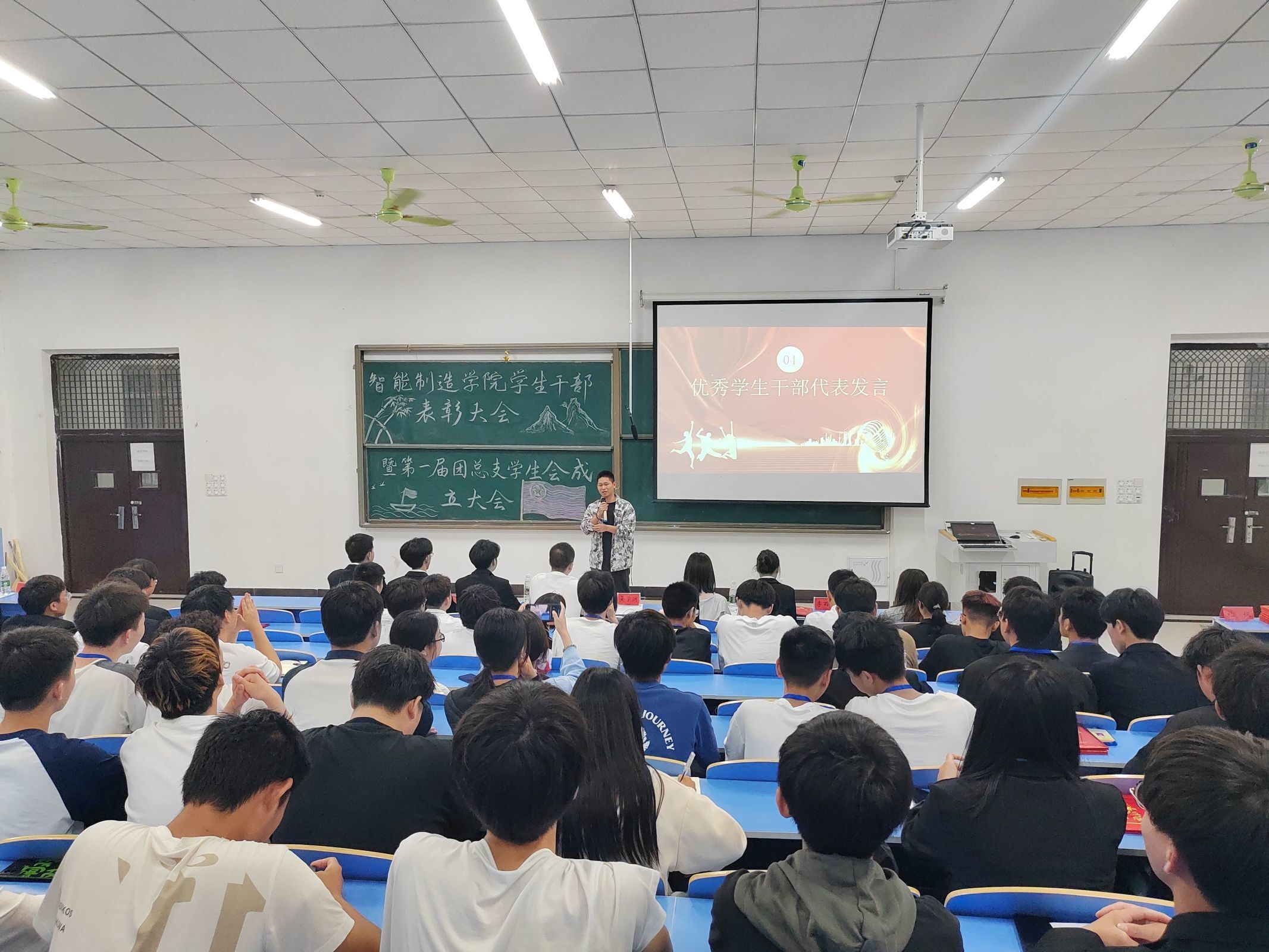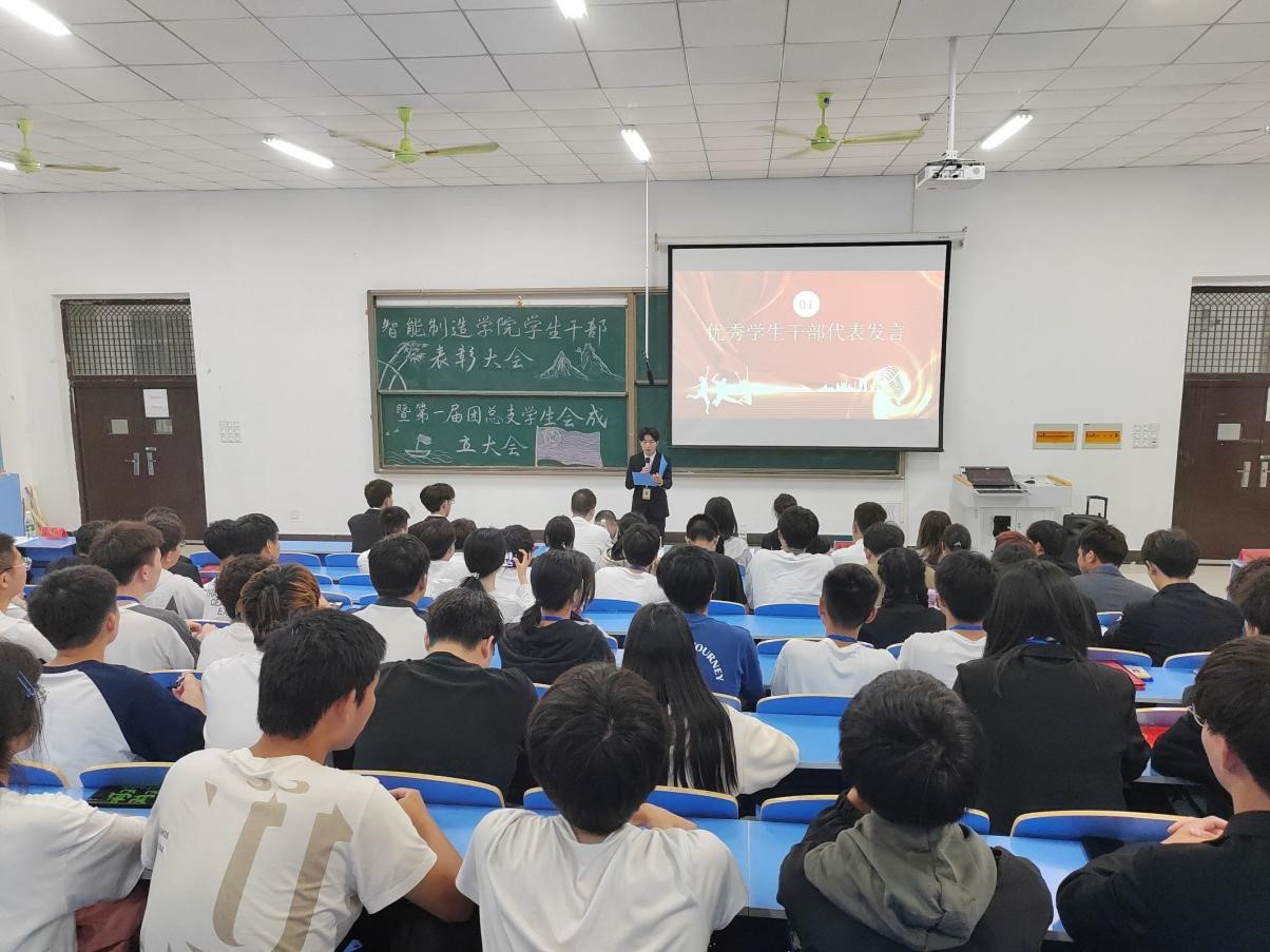 会上第十六届团总支学生会主席江自强代表优秀学生干部代表发言,他对在场的新一届学生干部们提出了许多期许,并祝愿智能制造学院的团学工作在新一届干部们的努力下,取得更优异的成绩。