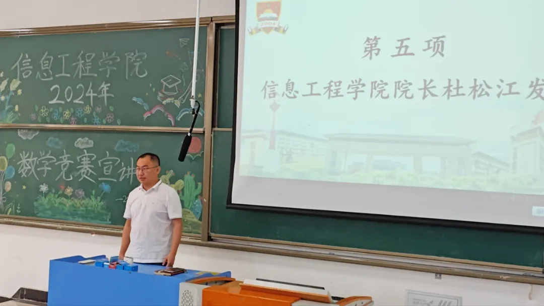 本网讯 为激发学生们对数学竞赛的兴趣,提升学生们的数学素养,培养学生们的逻辑思维,营造良好的学习氛围,信息工程学院于5月15日中午12:30在5205教室召开信息工程学院2024年数学竞赛宣讲会。本次宣讲会由信息工程学院张继成副院长主持,信息工程学院院长杜松江、教研室主任都俊杰、教师代表王安平、赵伟、李程以及各学院学生代表共同参加此次会议。