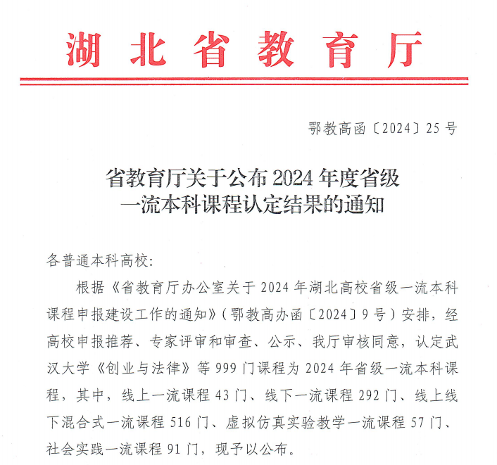 本网讯(通讯员 张继成)近日,省教育厅印发了《省教育厅关于公布2024年度省级一流课程认定结果的通知》,正式公布了2024年度省级一流本科课程,我校新增4门湖北省一流本科课程。其中,我院张继成老师负责的《计算机网络》、周桥梁老师负责的《数字电子技术》和汪莉老师负责的《C语言程序设计》3门线上线下混合式课程被认定为2024年度省一流本科课程。