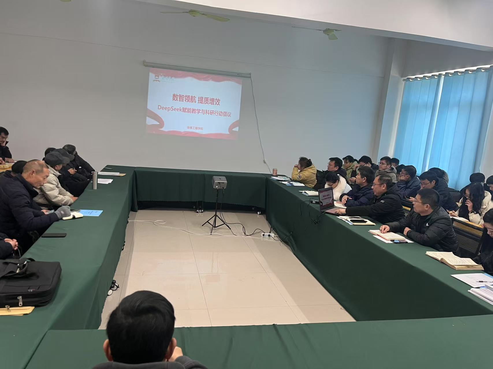 本网讯 2月21日,信息工程学院以“数智领航 提质增效”为主题,举办了DeepSeek赋能教学与科研行动倡议活动,通过专题学习与技术研讨,推动人工智能技术与教育实践深度融合。学院全体教职工参加活动,院长杜松江主持并作主旨发言。