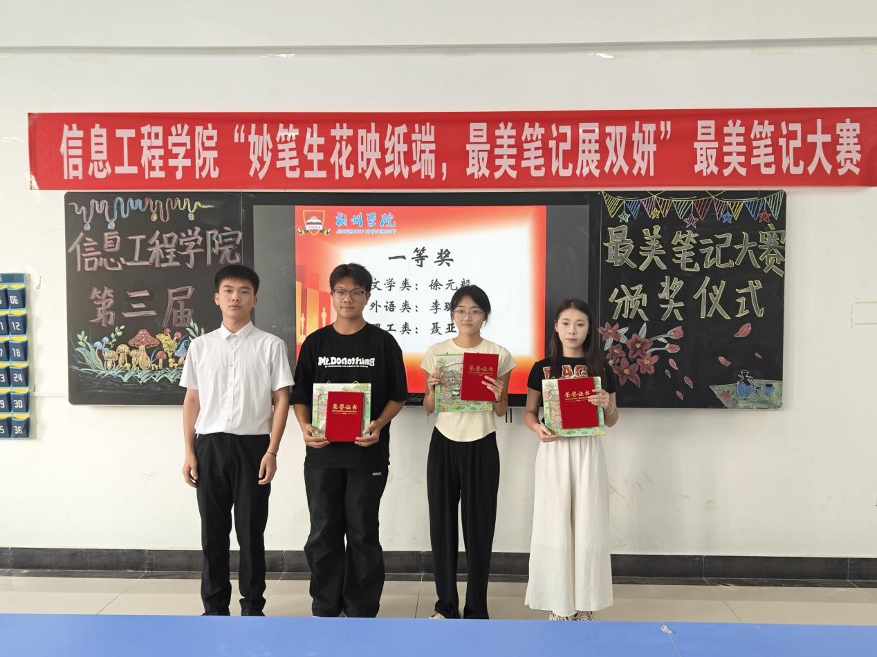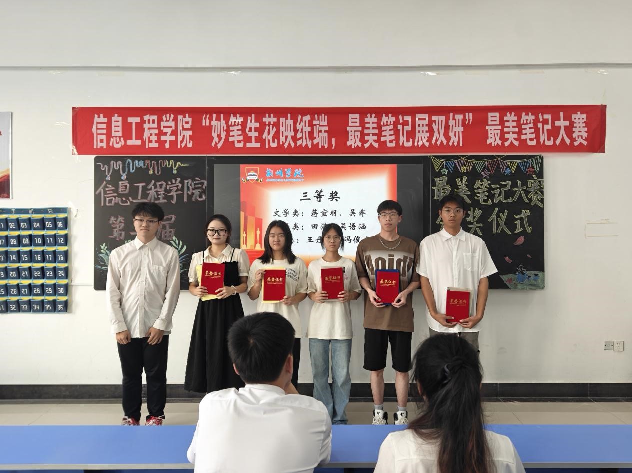 本网讯(通讯员 徐舒怡)为进一步营造浓厚的学习氛围,鼓励学生提升课堂学习效率,信息工程学院于6月12日晚在教学楼3404教室举办主题为“妙笔生花映纸端,最美笔记展双妍”的最美笔记大赛颁奖仪式。