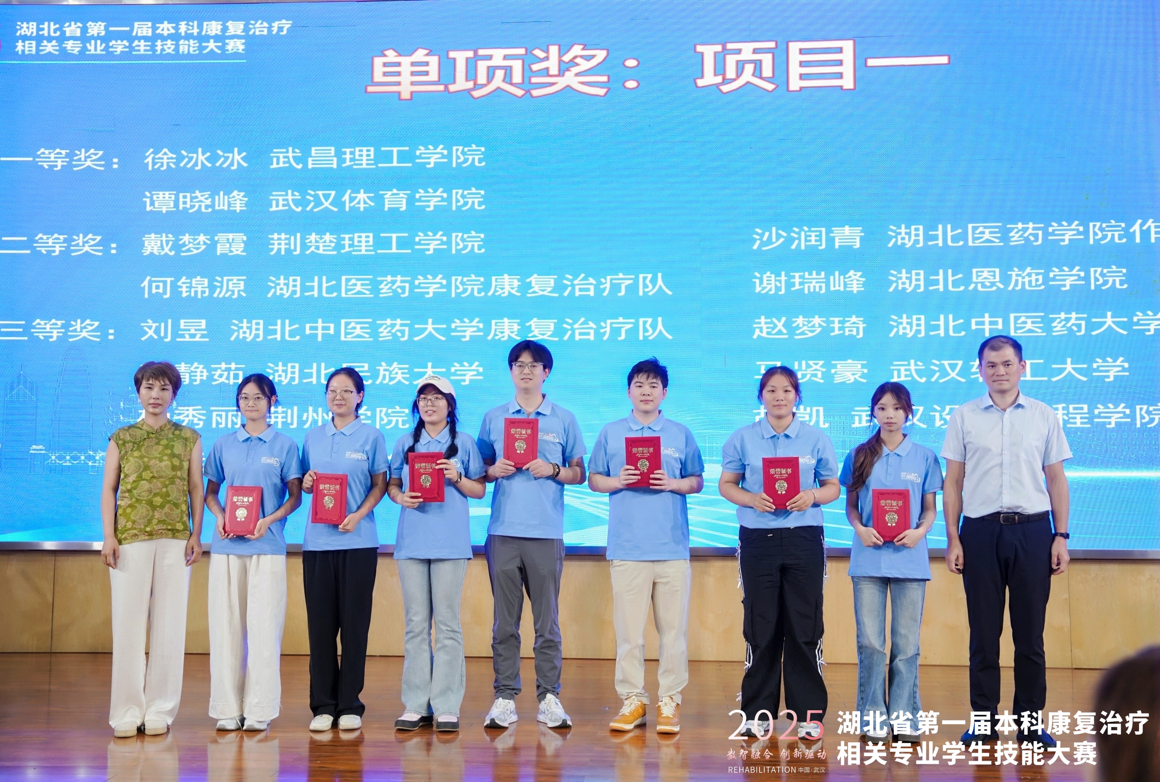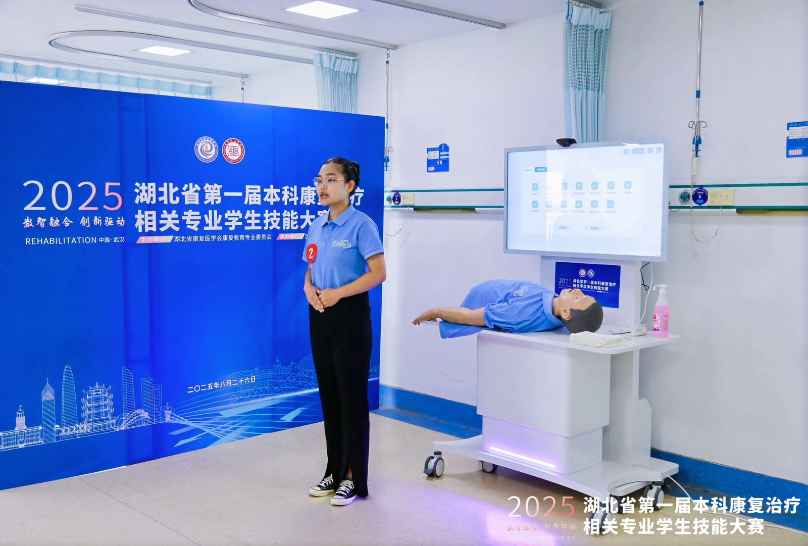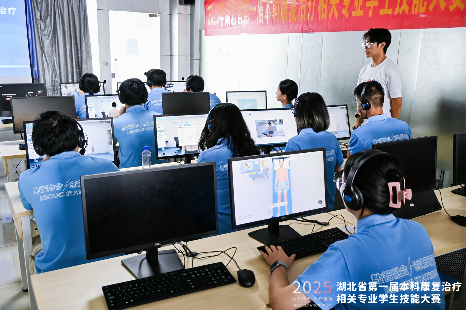本次大赛由湖北省康复医学会康复教育专业委员会主办,来自全省多所高校参加比赛,致力于提升康复治疗学专业学生的实践操作能力和专业素养,激发学生对专业技能的学习热情,增强学生就业竞争力。大赛采用团队赛制,由线上虚拟赛项和虚实结合线下操作赛项(康复问诊、康复评定、康复治疗)两部分内容组成。