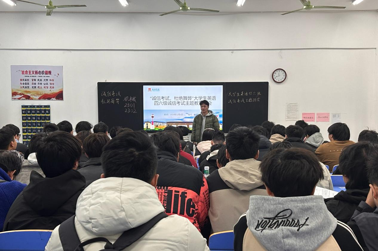 本网讯(通讯员 柯婷)全国大学生英语四六级考试在即,为进一步严肃考场纪律,筑牢学生诚信应考思想根基,营造公平公正的考试环境,12月1日至5日,智能制造学院组织各班级有序开展四六级考风考纪专题教育班会。本次系列教育活动由各班级辅导员牵头主持,全体学生参与。