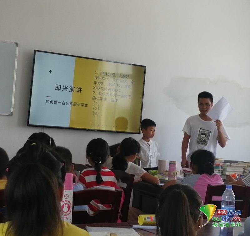 图为孩子正在讲台上做自我介绍,然后讲述如何做一名合格的小学生。紧张而刺激的即兴演讲课,不仅锻炼了孩子们的胆量,还提升了孩子们思考问题的能力。中国青年网通讯员 卢盼 摄