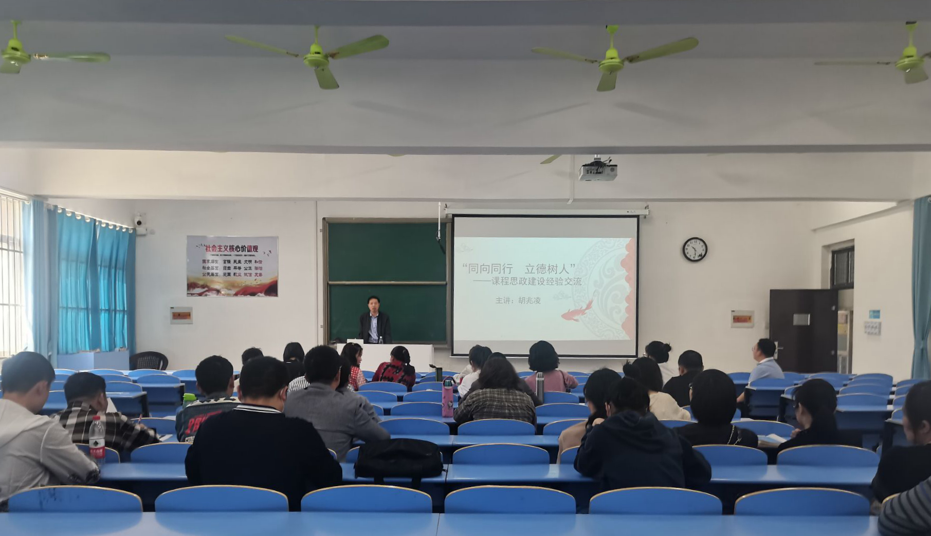 最后,李主任对本次培训进行了总结。他指出,胡院长的讲座全面介绍了课程思政的内涵,并用详实的案例指导教师进行课程设计,使我校青年教师对课程思政有了更深入的理解。他同时强调,当前国家越来越重视课程思政建设,同时课程思政也被纳入了今年学校新版课程质量评价标准中,各位青年教师应当对此高度重视,对照示范案例改进授课方式方法,加强课程思政建设工作,推动我校教育教学事业高质量发展。