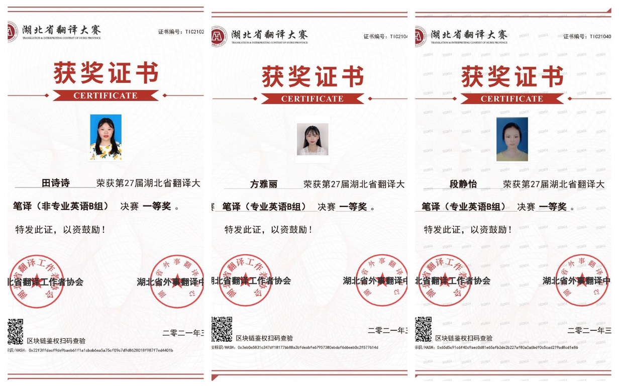 本网讯(通讯员 何龙)近日,湖北省翻译大赛组委会公布了第27届湖北省翻译大赛决赛获奖名单,我院外国语学院段静怡、方雅丽、田诗诗三位同学喜获专业英语组笔译类一等奖。