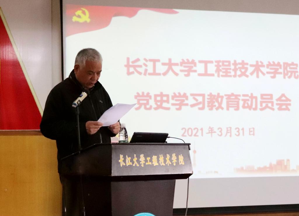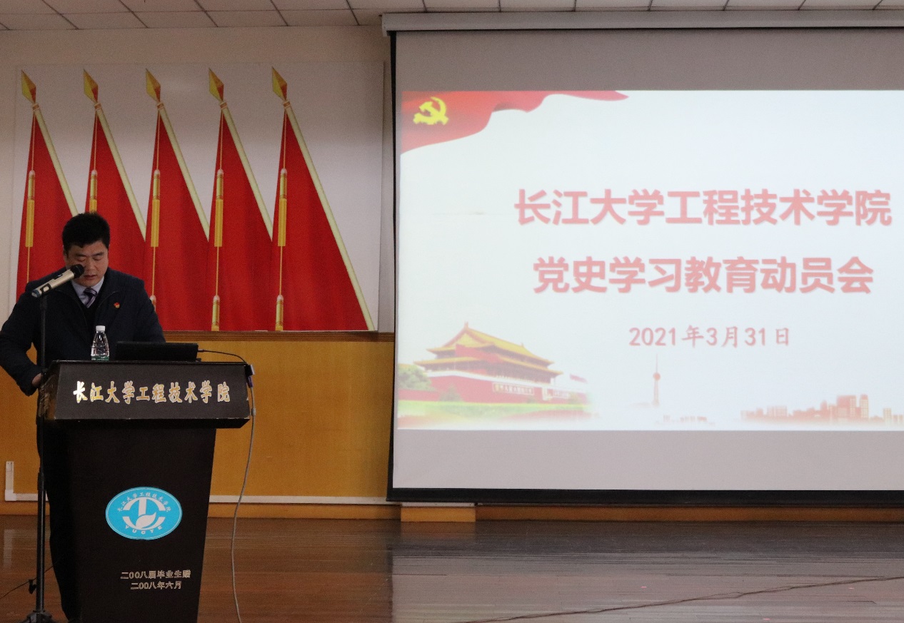 本网讯(记者 黄思琦)3月31日上午,长江大学工程技术学院党史学习教育动员大会在行政楼第二会议室召开。学院领导、全体中层干部、思政课教师、各党支部书记、兼职组织员、民主党派代表、学生党员代表和青马班学员代表参加会议。会议由学院院长楼一珊主持。