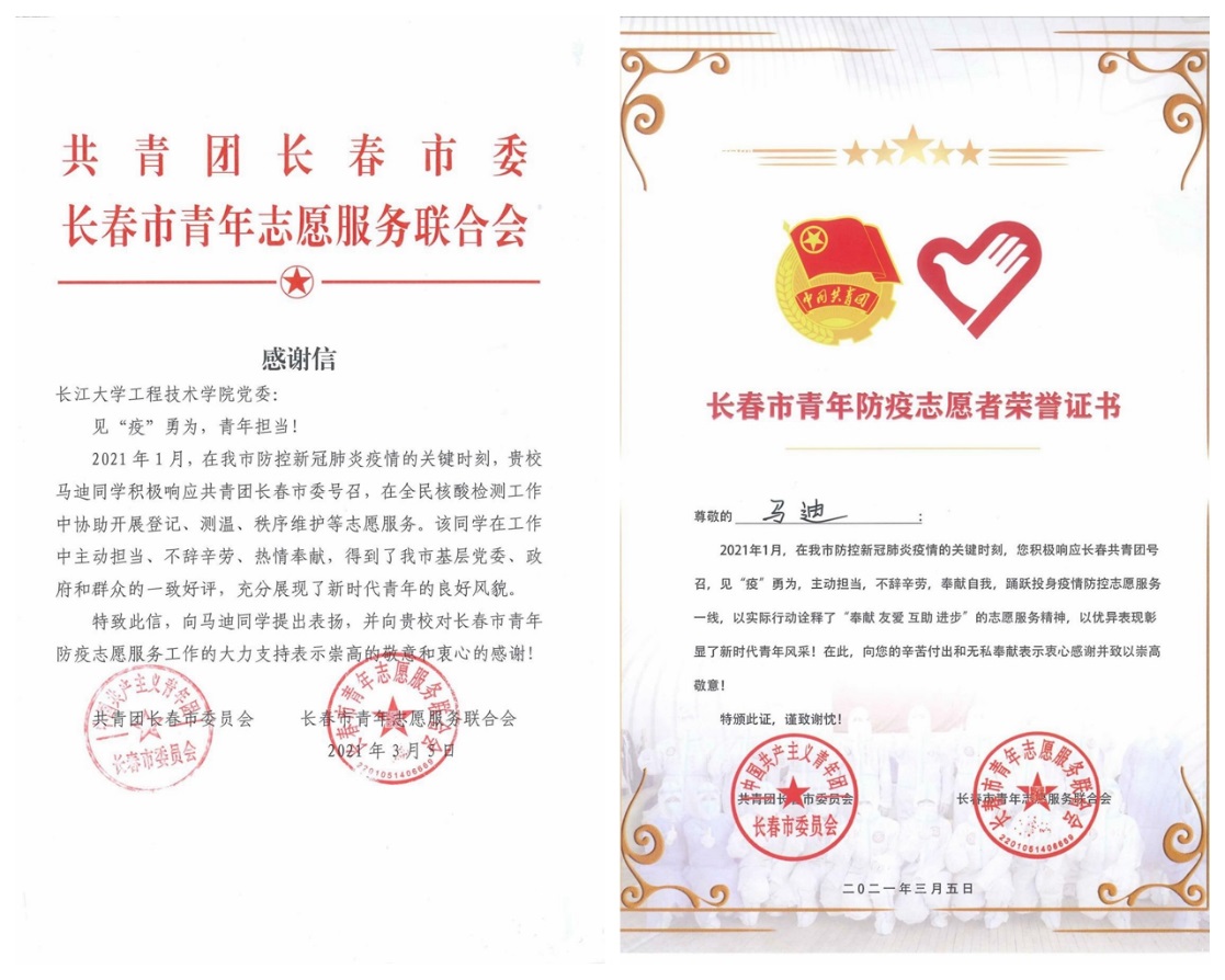 本网讯(记者 黄思琦)近日,学院党委收到一封来自共青团长春市委、长春市青年志愿者服务联合会的感谢信,信中对我院石油与化学工程2018级马迪同学积极响应共青团长春市委号召,主动参与全民核酸检测工作表示感谢。