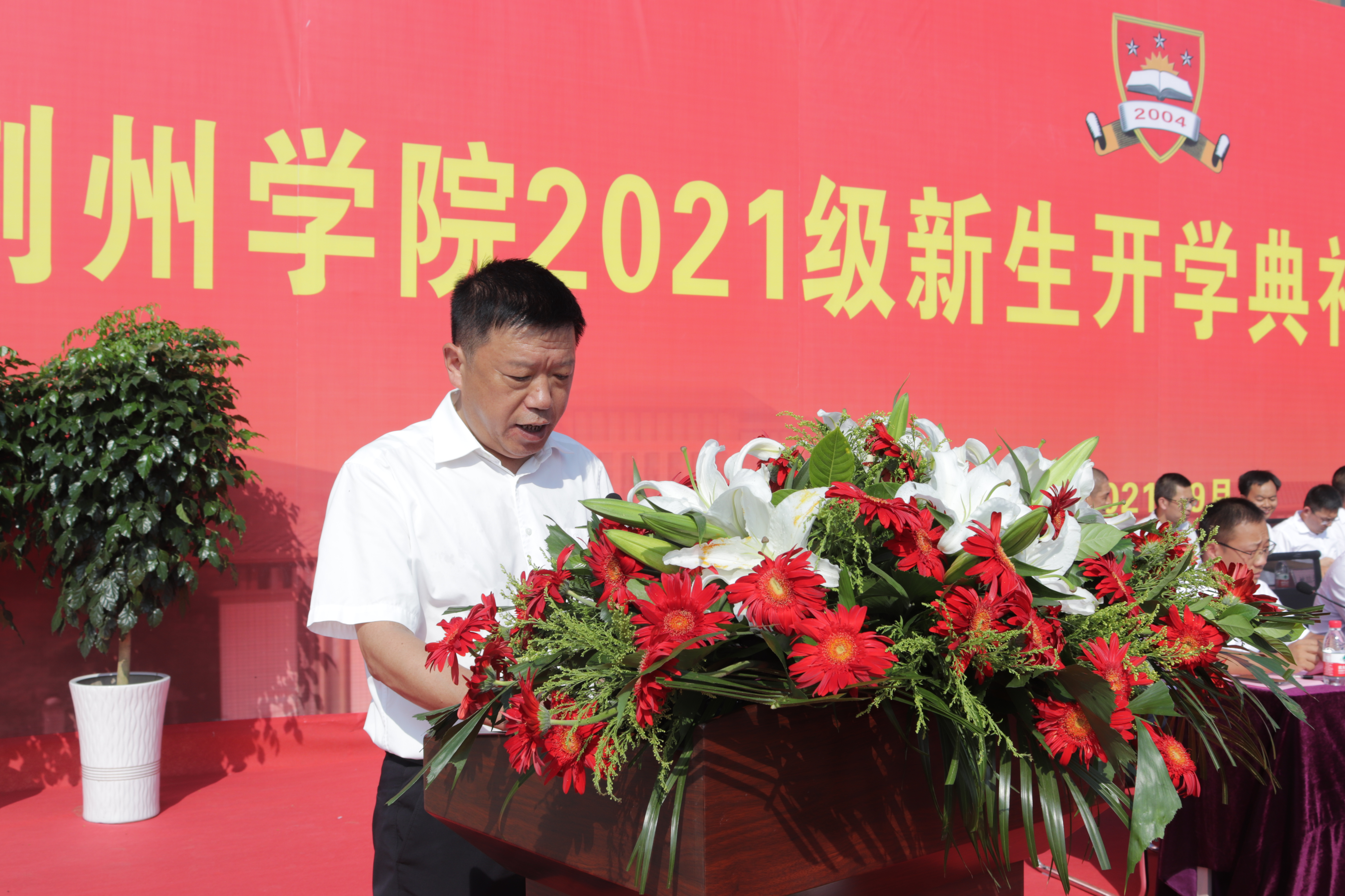 教师代表数理学院赵伟老师在发言中,希望同学们在大学中做一个有情怀、勇敢追梦的新时代青年。面对时代风雷激荡,要在机遇和淬炼中找到自己的舞台,要学习传承先辈用热血和生命铸就而成的大学精神,坚守初心,直面挑战,勇立潮头、搏击风雨,用青春和汗水书写人生新的华章。