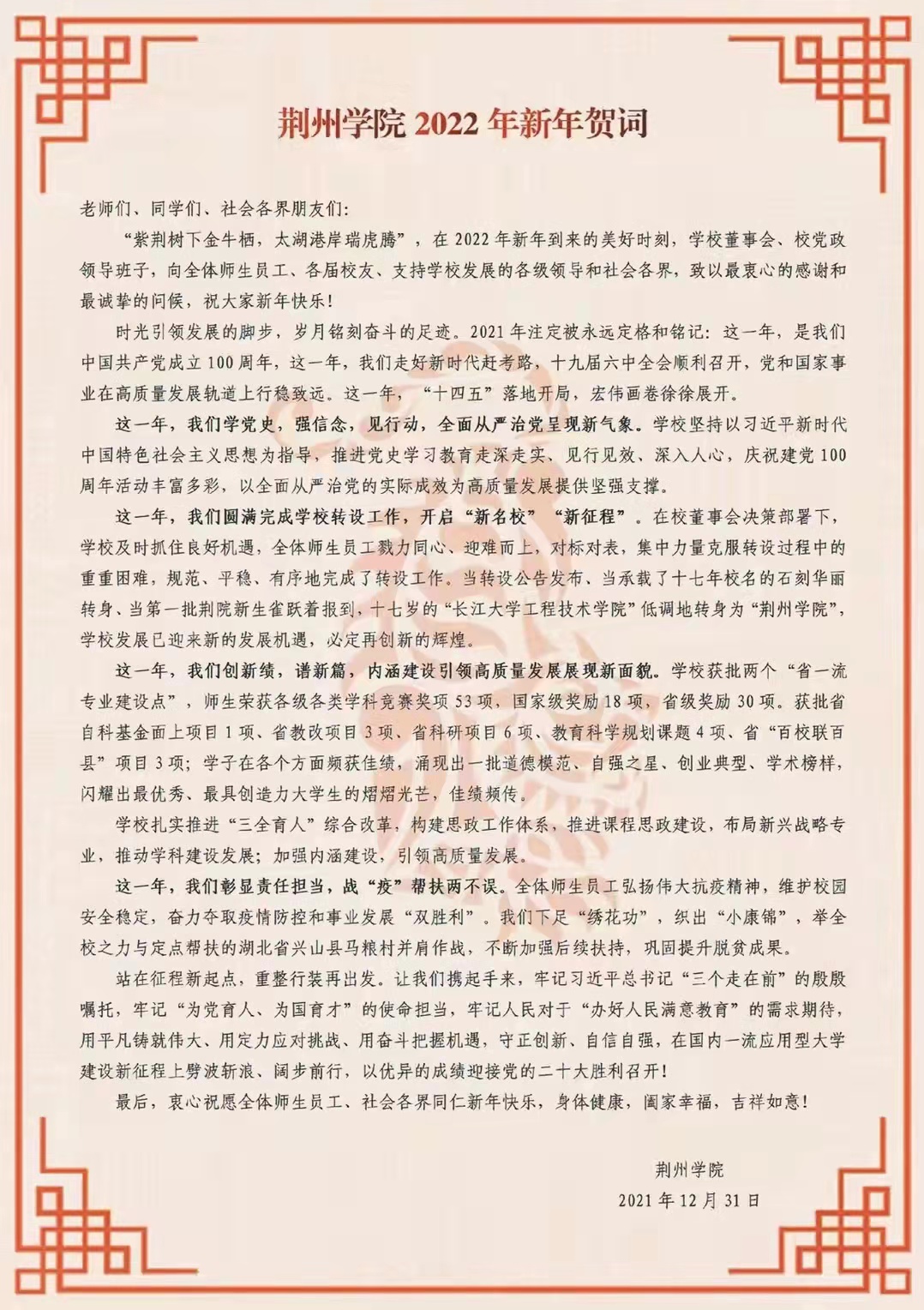 综合要闻 缤纷校园 教学科研 媒体荆院 通知公告 学术动态 WilliamHill中文官方网站2022年新年贺词 来源: 编审: 审核: 签审: 日期:2021-12-31 上一篇: 春来教育集团2022年新年贺词 下一篇: 【驻村帮扶】WilliamHill中文官方网站文化艺术进村助乡村振兴 返回列表页 最新文章 【学校动态】学校党委召开2026年春季学期党建... 【组织学习】WilliamHill中文官方网站党委理论学习中心组召开... 【学校动态】我校组织参加2026年本科教学工作... 【校企合作】WilliamHill中文官方网站与湖北康盟中药有限公司... 【学校动态】学校召开2026年校级智慧课程立项... 【喜讯】我校入选全国高校“大思政课”实践教学...