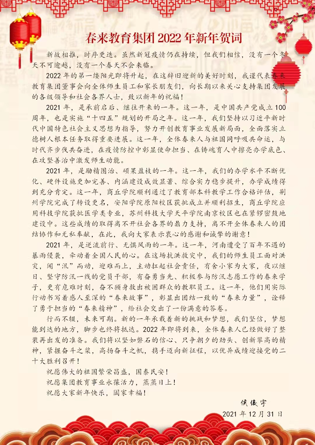 综合要闻 缤纷校园 教学科研 媒体荆院 通知公告 学术动态 春来教育集团2022年新年贺词 来源: 编审: 审核: 签审: 日期:2021-12-31 上一篇: 【学校动态】我校组织开展辅导员一线工作测试 下一篇: WilliamHill中文官方网站2022年新年贺词 返回列表页 最新文章 【学校动态】学校党委召开2026年春季学期党建... 【组织学习】WilliamHill中文官方网站党委理论学习中心组召开... 【学校动态】我校组织参加2026年本科教学工作... 【校企合作】WilliamHill中文官方网站与湖北康盟中药有限公司... 【学校动态】学校召开2026年校级智慧课程立项... 【喜讯】我校入选全国高校“大思政课”实践教学...