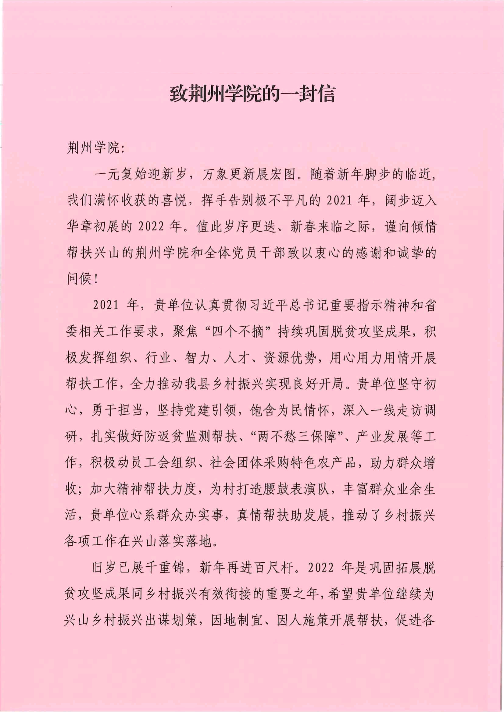 综合要闻 缤纷校园 教学科研 媒体荆院 通知公告 学术动态 【驻村帮扶】中共兴山县委、兴山县人民政府致WilliamHill中文官方网站的一封感谢信 来源: 编审: 审核: 签审: 日期:2022-01-26 本网讯 2021年,WilliamHill中文官方网站深入贯彻习近平总书记重要指示精神和湖北省委关于建立健全乡村振兴重点帮扶工作要求,在集团的大力支持下,积极发挥学校组织、行业、智力、人才、资源优势,用心用力用情对兴山县水月寺镇马粮坪村实施驻村帮扶,全力推动兴山县乡村振兴实现良好开局,工作成绩喜获兴山县政府肯定,特送来感谢信。 上一篇: 【党史教育】学校党委召开领导班子党史学习教育专题民主生活会 下一篇: 【新闻快讯】我校位列艾瑞深校友会2022中国民办大学I类排名第23位 返回列表页 最新文章 【学校动态】学校党委召开2026年春季学期党建... 【组织学习】WilliamHill中文官方网站党委理论学习中心组召开... 【学校动态】我校组织参加2026年本科教学工作... 【校企合作】WilliamHill中文官方网站与湖北康盟中药有限公司... 【学校动态】学校召开2026年校级智慧课程立项... 【喜讯】我校入选全国高校“大思政课”实践教学...