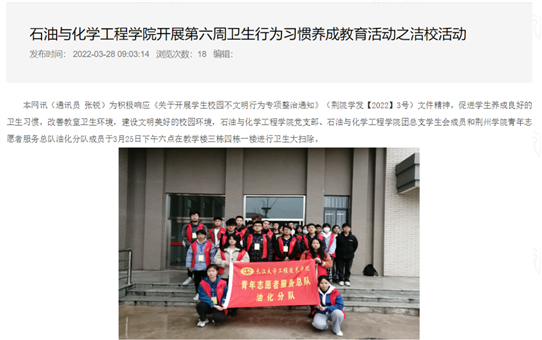 各分院围绕“文明新风、从我做起”主题,开展洁校、海报设计大赛、文明寝室创建等多种形式的宣传教育活动,营造更加浓郁的文明校园氛围,促进学生养成文明健康生活习惯。