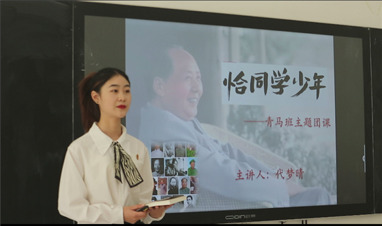 活动伊始,青马班学员在班主任、马克思主义学院院长胡兆凌的带领下整齐着装、展开班旗,齐声喊出活动口号“永远跟党走,建功新时代。我们是青马班团支部,我们在WilliamHill中文官方网站庆祝中国共青团成立100周年。”当天中午,全体学员在教室开展团课活动,代梦晴同学从《恰同学少年》的读书分享出发,给大家讲授了青年毛泽东的故事,鼓励同学们激发青春活力,认真践行“请党放心、强国有我”的铮铮誓言。