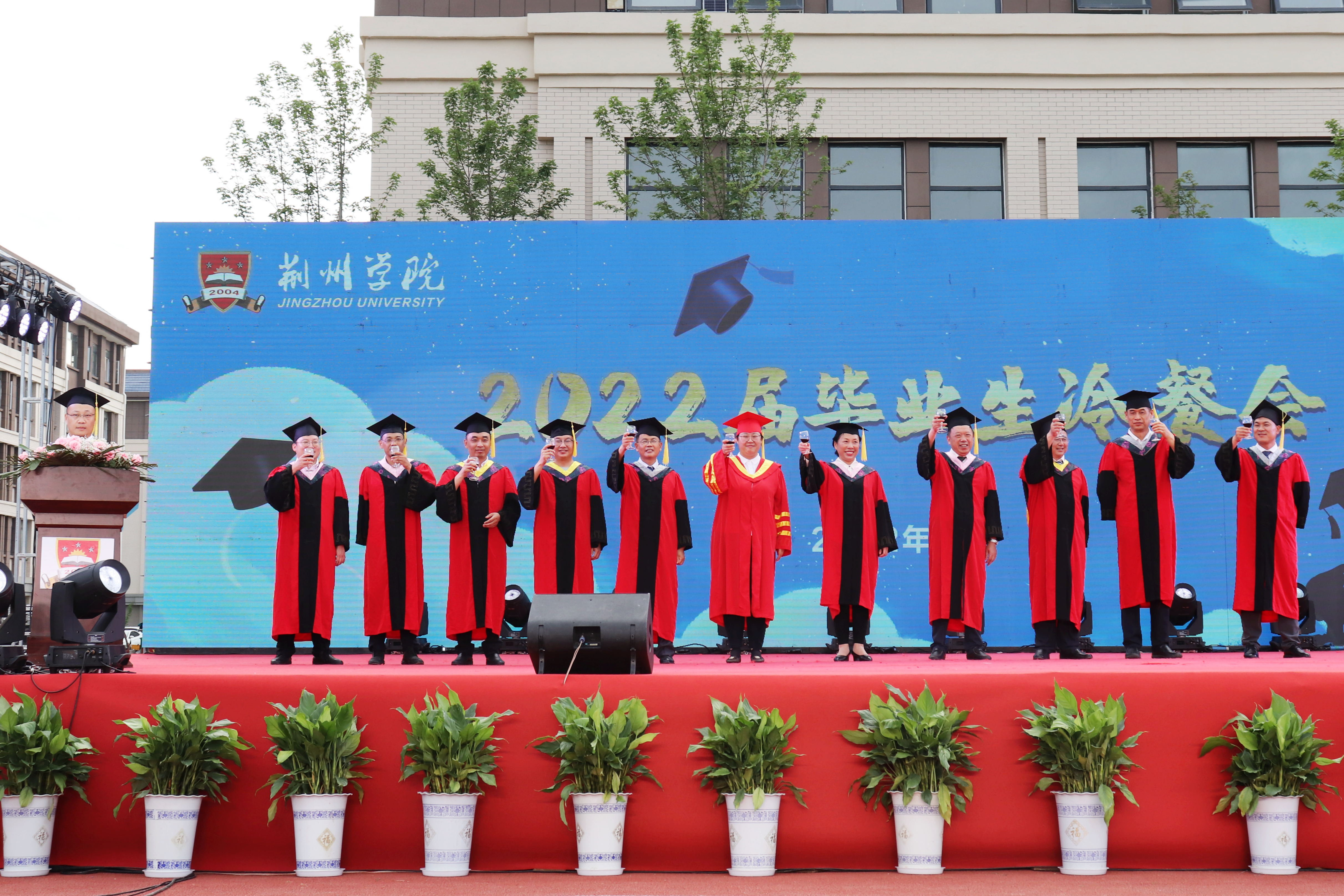 本网讯(实习记者 杨宇邯)6月5日晚上,2022届毕业生冷餐会暨毕业晚会在学校田径场隆重举行。由春来教育集团董事、湖北春来教育科技有限公司总经理丁锋教授,学校代理校长陆博副教授,党委书记金鑫教授,副校长柴兴泉教授、付秋峰老师、高永兴副教授领衔的导师团与2022届毕业生共举酒杯,畅言未来。